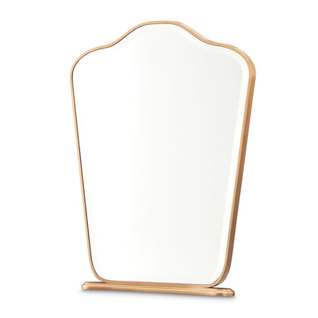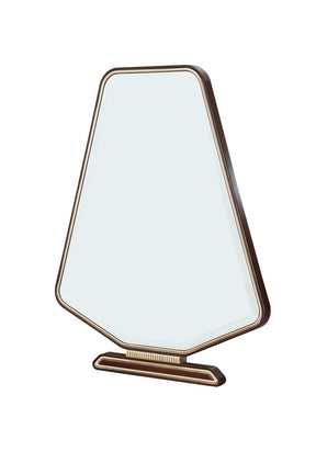 A striking blend of modern geometry and timeless elegance, the Houston Vanity Mirror is designed to elevate any space. Its bold, angular silhouette is framed in rich walnut, accented with a sleek gold trim that enhances its refined aesthetic. The sturdy base features coordinating gold accents, adding a touch of understated glamour. A beveled edge completes the look, creating depth and dimension for a polished finish.