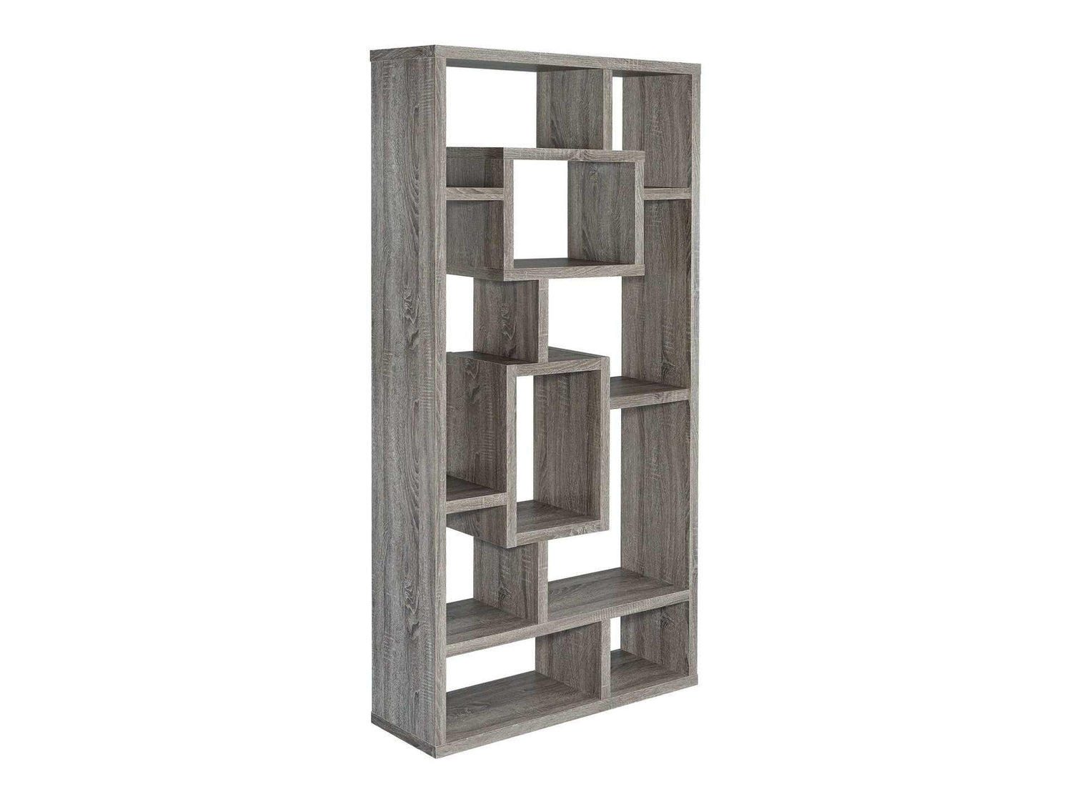 A whimsical silhouette captures attention as it offers essential space for display. This fun bookcase presents a puzzle-like profile with exceptional charm. Ten shelves in a variety of configurations provide plenty of room to show off decor and photographs, as well as books and planted greenery. Enjoy a sleek weathered grey finish that enhances its contemporary creds. This modern bookcase makes an excellent companion to home office decor.