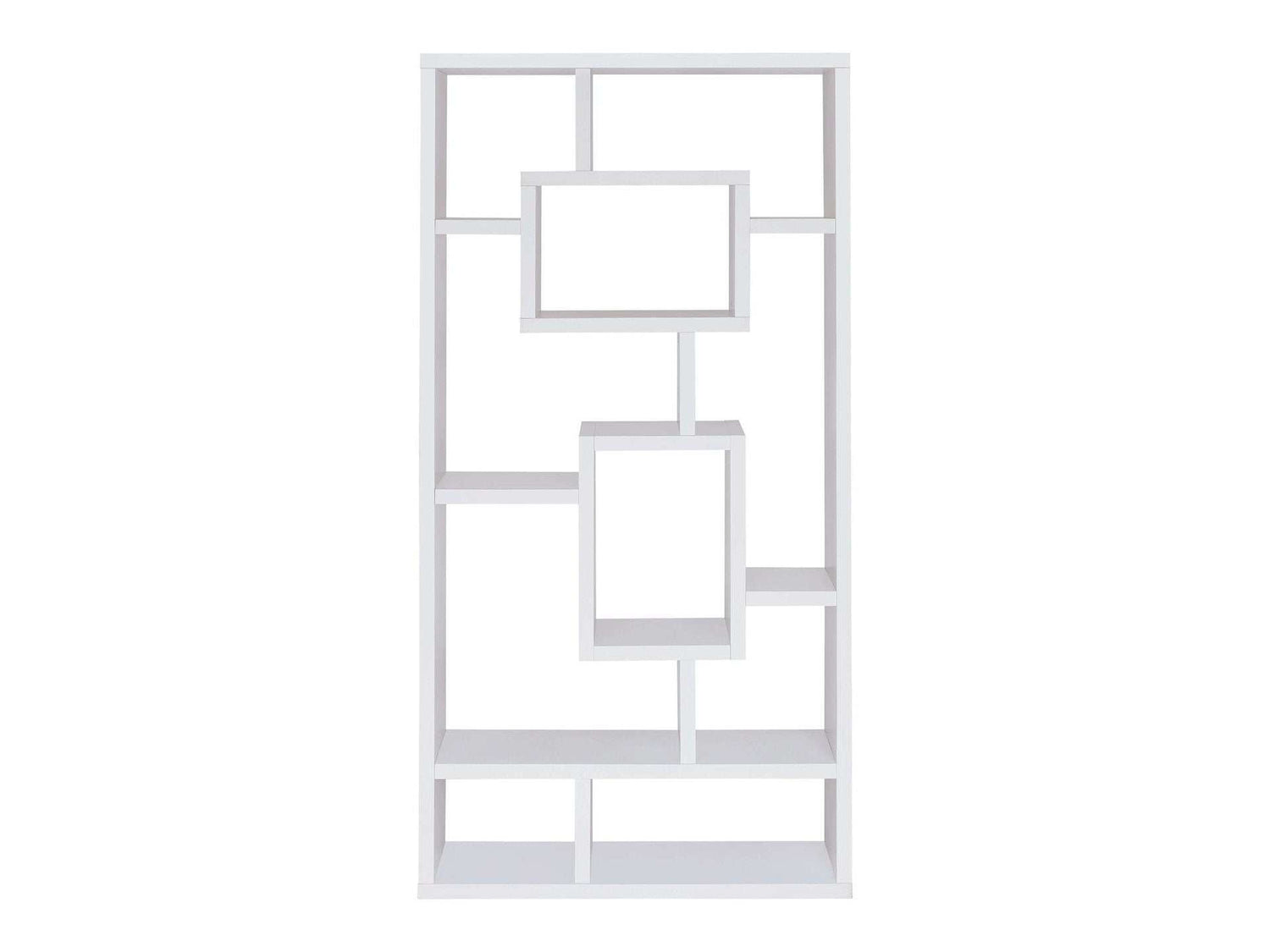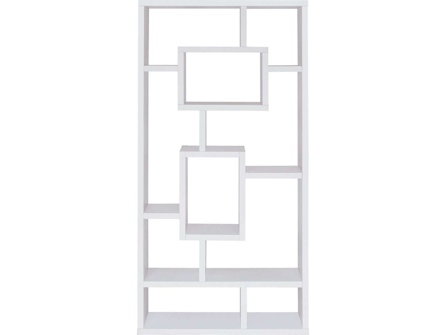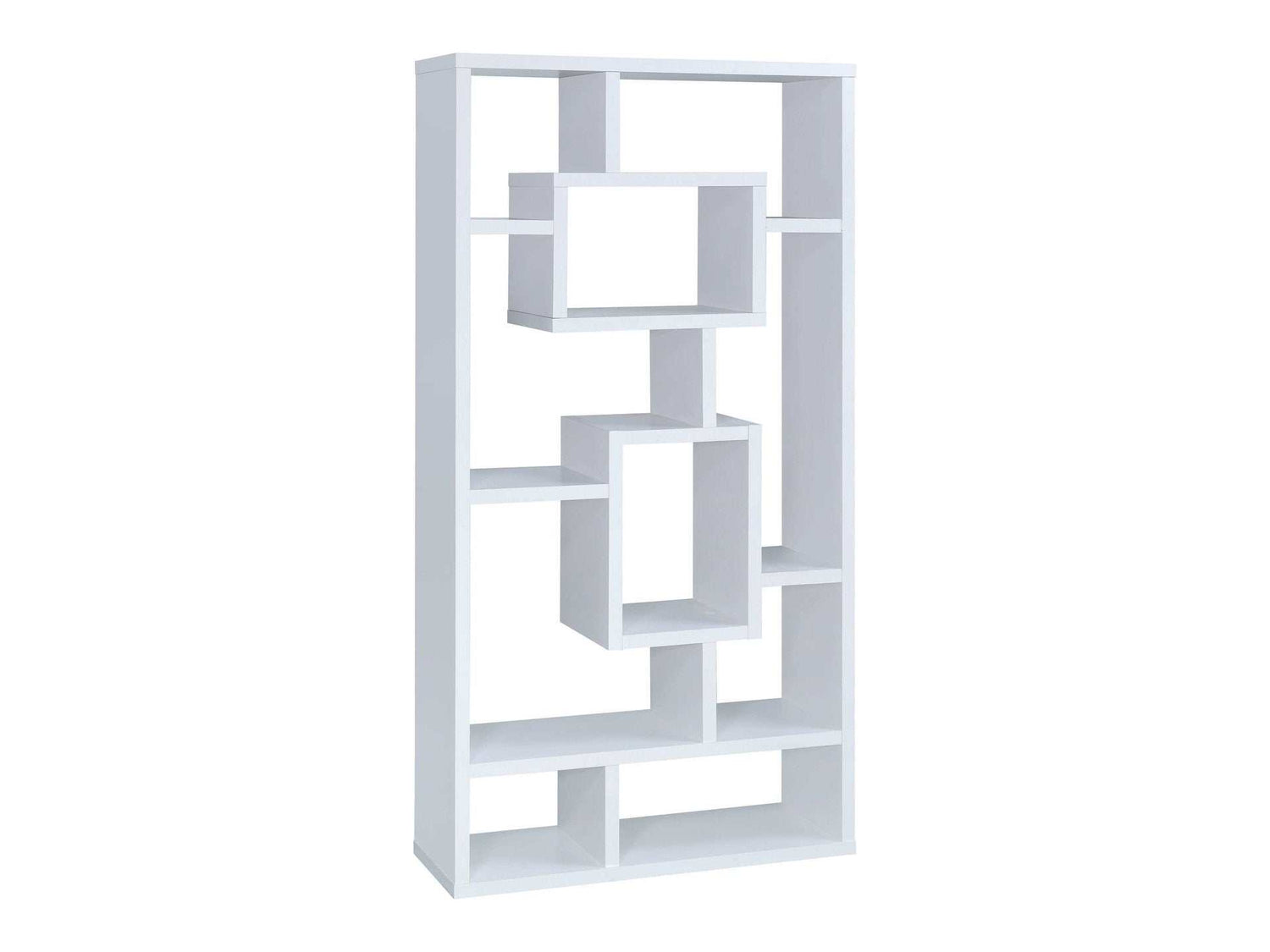 Put your most cherished memories on proud display. This bold bookcase features ten shelves of various sizes to show off your favorite keepsakes. With expert craftsmanship and high-quality materials, it provides safe, sturdy storage. Its cool, contemporary silhouette adds artsy appeal to a room with its striking, geometric shapes. This bookcase is available in white, cappuccino, or weathered grey for a variety of options to fit any decor.