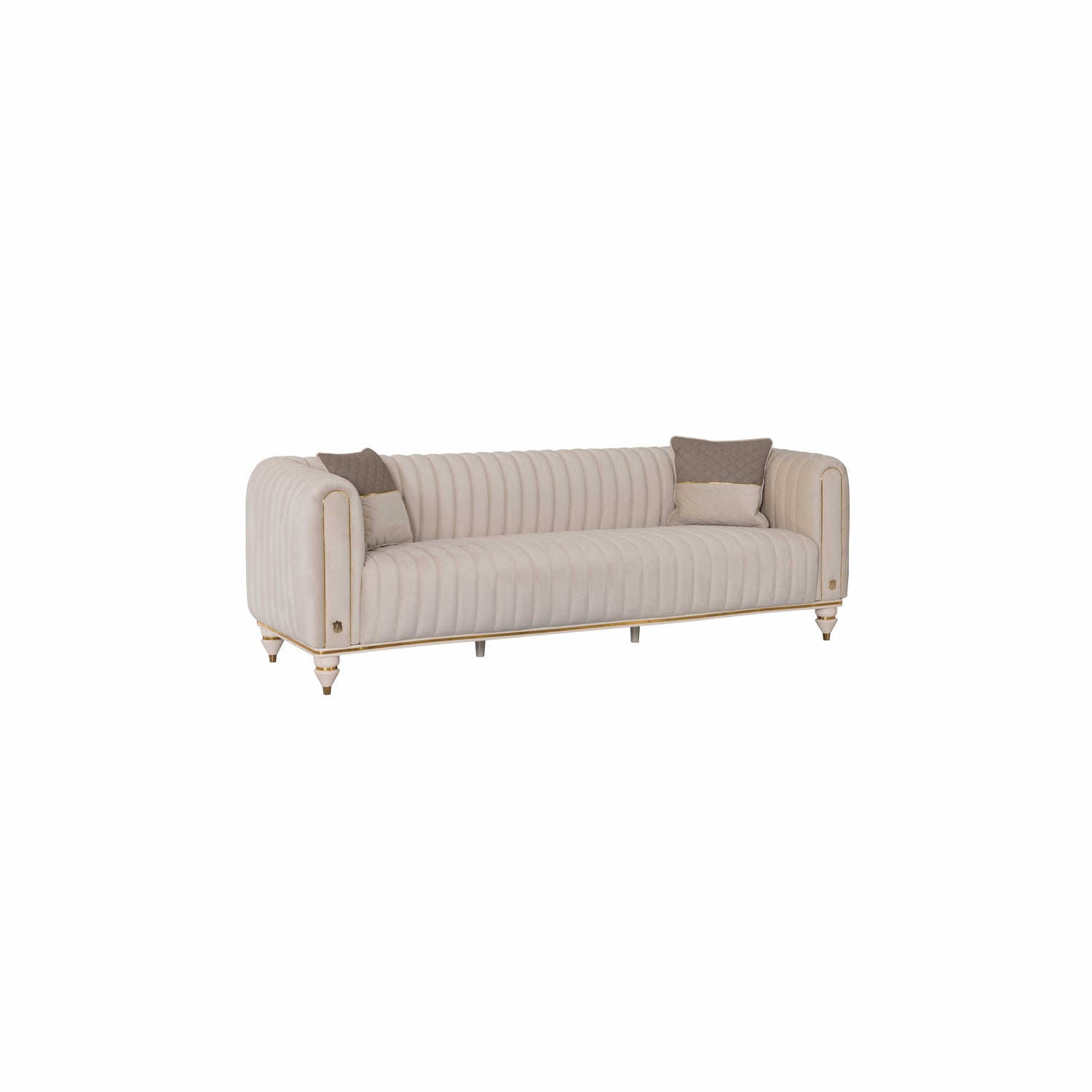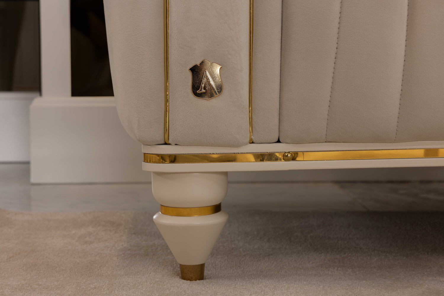 The Inci Ivory Sofa combines luxury and durability with its velvet high-quality upholstery, soft and sturdy design, and elegant gold accents. Enjoy the included pillows for added comfort. Upgrade your living space with this stylish and functional sofa.