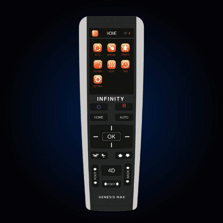 Gen Max 4D is all about customized massage — you control the intensity and target relief, from the speed and depth of the rollers, to how much the airbags are inflating, to the music that is played on the speakers. Use the all-new, intuitive Infinity Controller, or connect your phone through Bluetooth and use the Gen Max App which puts the chair controls into your own pocket. The 4D Back Massage Mechanism gives you deep-tissue massage that mimics the feel of human hands massaging down your back and into your glutes. For the ultimate back relief, try the Spinal Decompression Stretch feature in the Extension program, Weightless Zero Gravity Recline or the built-in soothing Nature Sounds. And let's not forget the lower half of your body with the Complete Calf™ Kneading & Oscillating massage combined with the Triple Roller Total Sole Reflexology rollers — much needed relief after being on your feet all day. Worried about space? Relax, the Zero Wall Fit™ Space-Saving Technology requires only 2" of space behind the backrest at any given position.