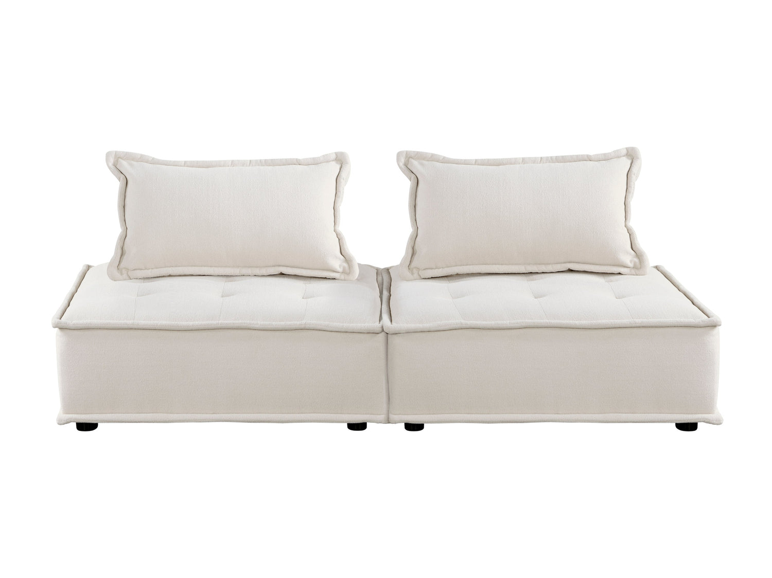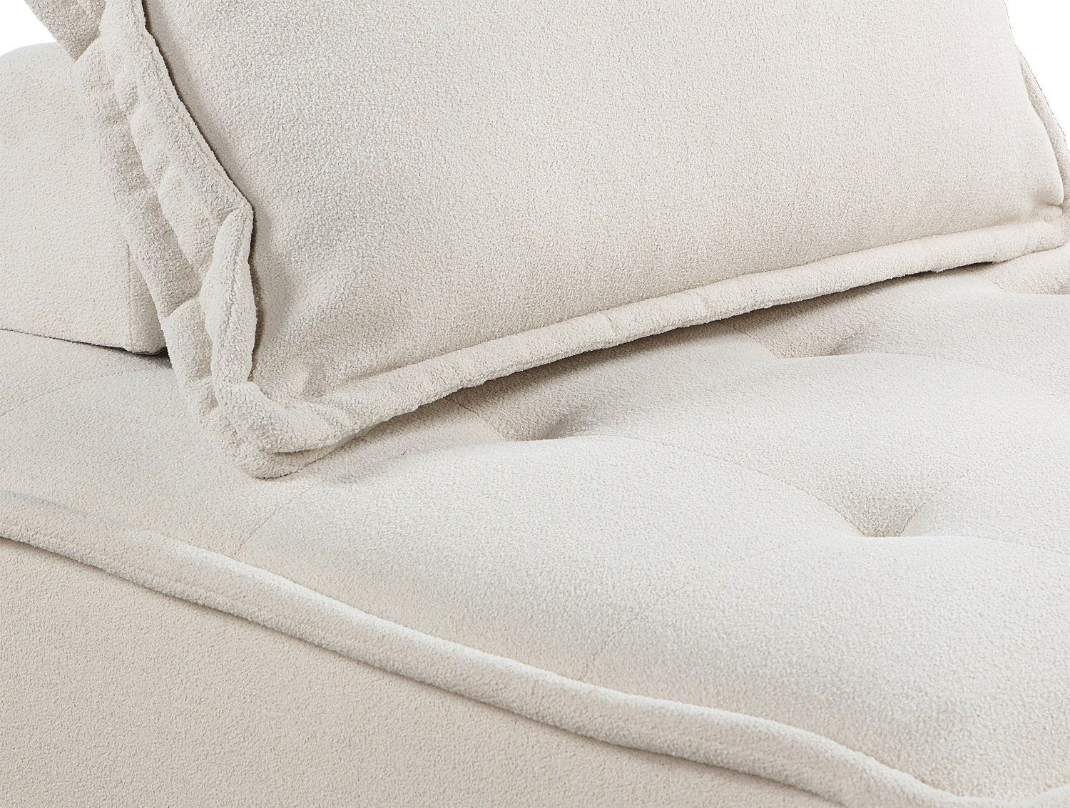 With a look that presents the hallmarks of modern design and allows for functional placement within your living room, the Inman Collection is a perfect seating option for your family’s needs. Two square ottoman-style modular accent chairs are paired for a custom love seat perfect for your available space or occasion needs. Beige boucle fabric upholstery covers the collection. The low-profile stance of the chair lends to the modern profile while the zipper-paired pillow and bolster provide supporting accent.