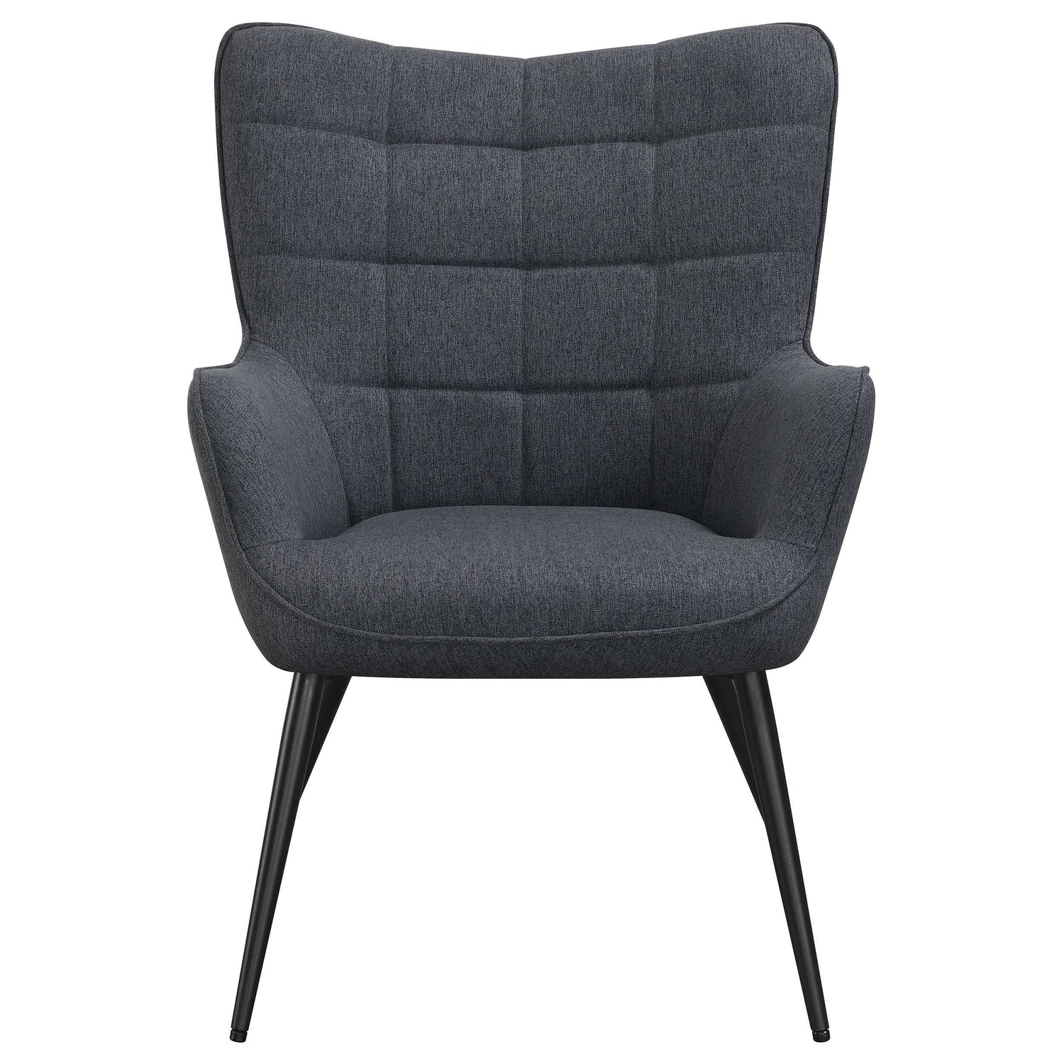 This eye-catching mid-century modern accent chair offers up a vintage vibe with its contoured design and slim legs. A biscuit tufted backrest offers modern take on the classic wingback design with flared corners. Narrow, softly flared arms further lend to the retro look too. The relaxing seat is wrapped in a soft woven fabric, inviting you to rest comfortably. Resting on narrow, flared metal legs in a black finish, this accent chair offers an eclectic, playful charm to a space.