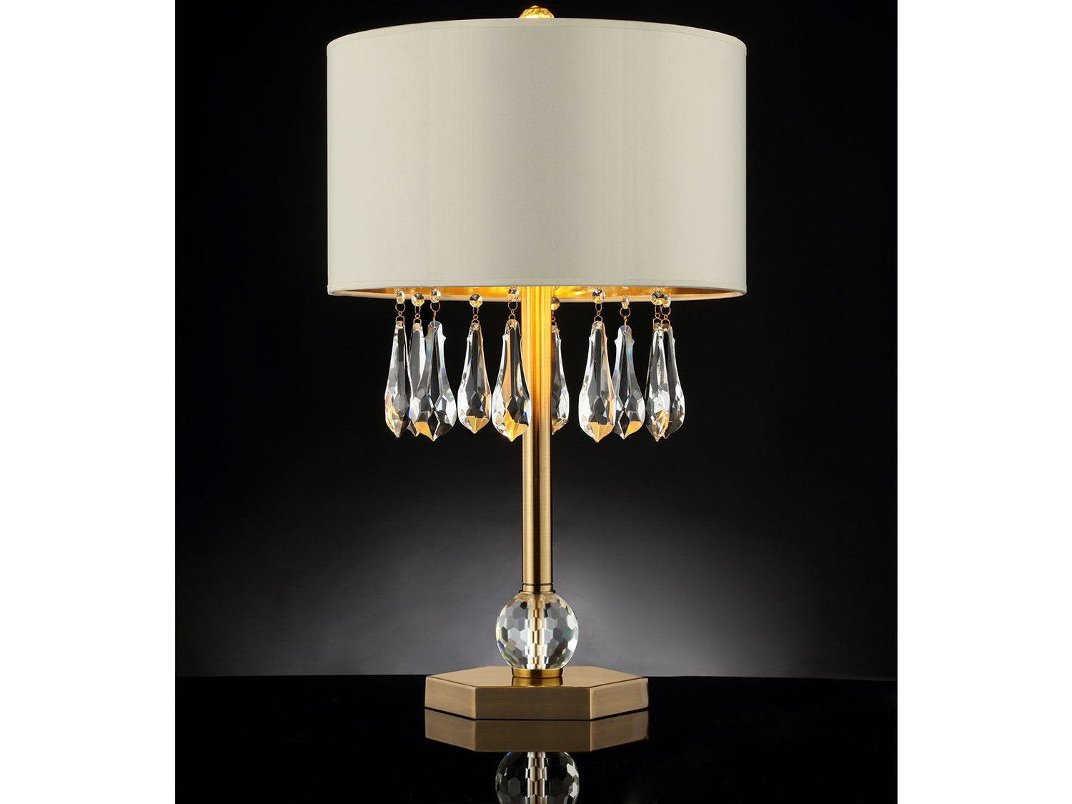 Brilliant faux crystals reflect the shiny gold inseam of the otherwise classic white lampshade. Combined, they form the elegant design of this beautiful table lamp. Features include additional gold highlights, a mystical crystal ball and a hexagonal base.