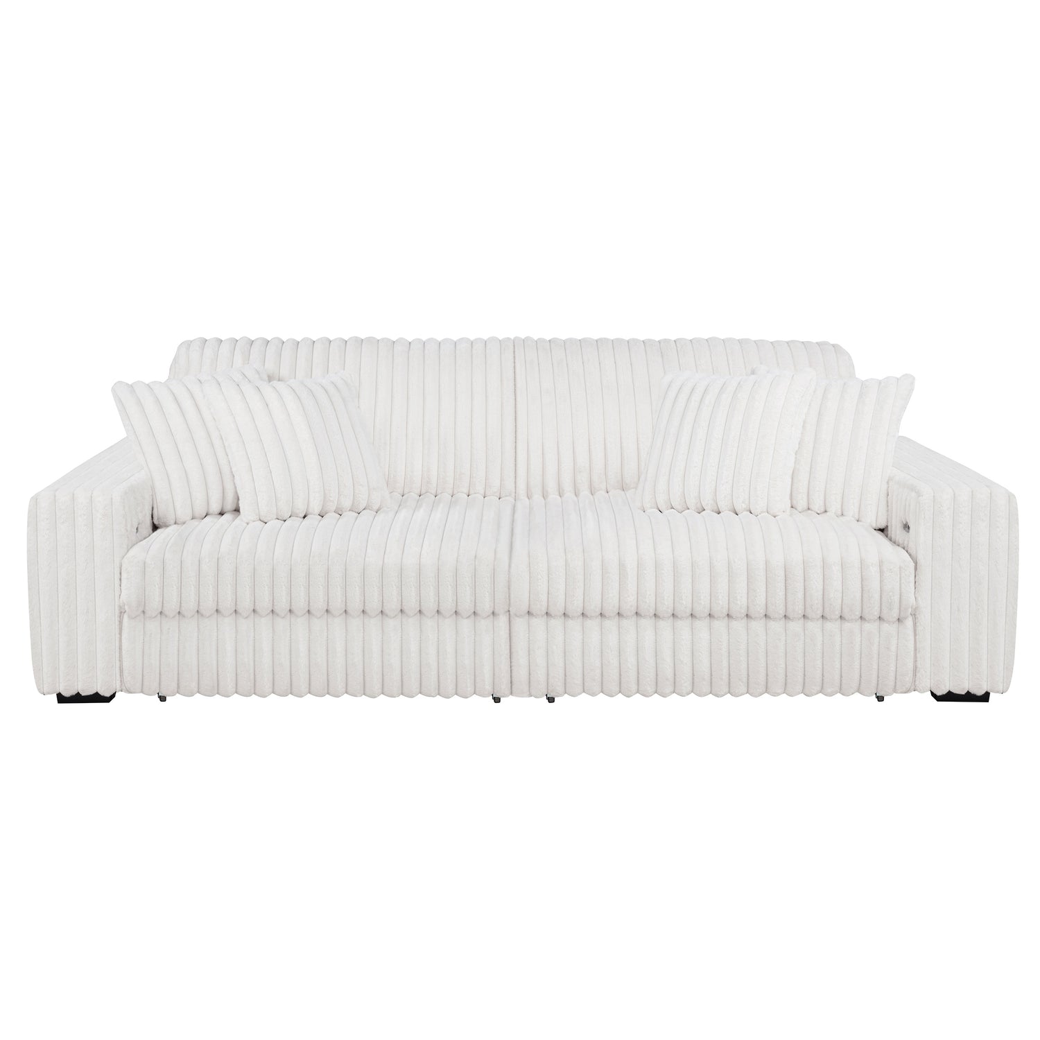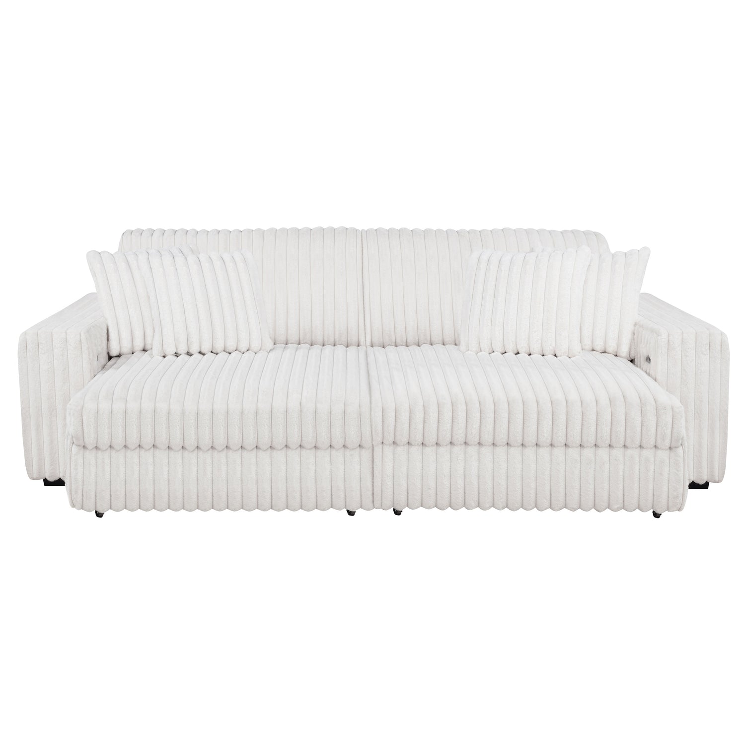 - Contemporary sofa set in ivory corduroy features deep channel tufting and dual power chaise design,