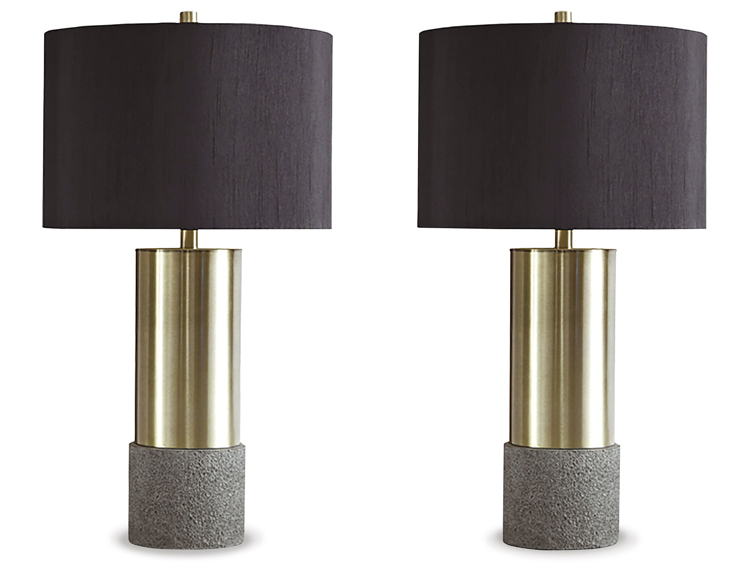 Faux concrete sets the stage for this ultra contemporary brass-tone table lamp. This substantial lamp is topped with a chic all-black shade with a gold-tone foil interior for an elegant aesthetic.