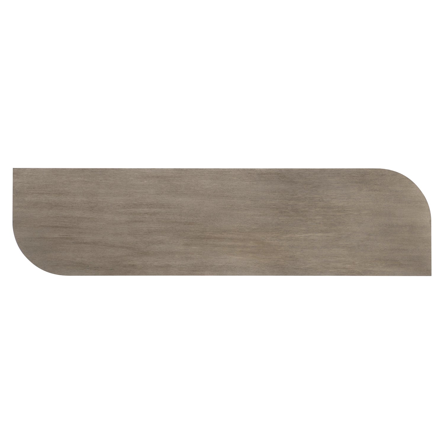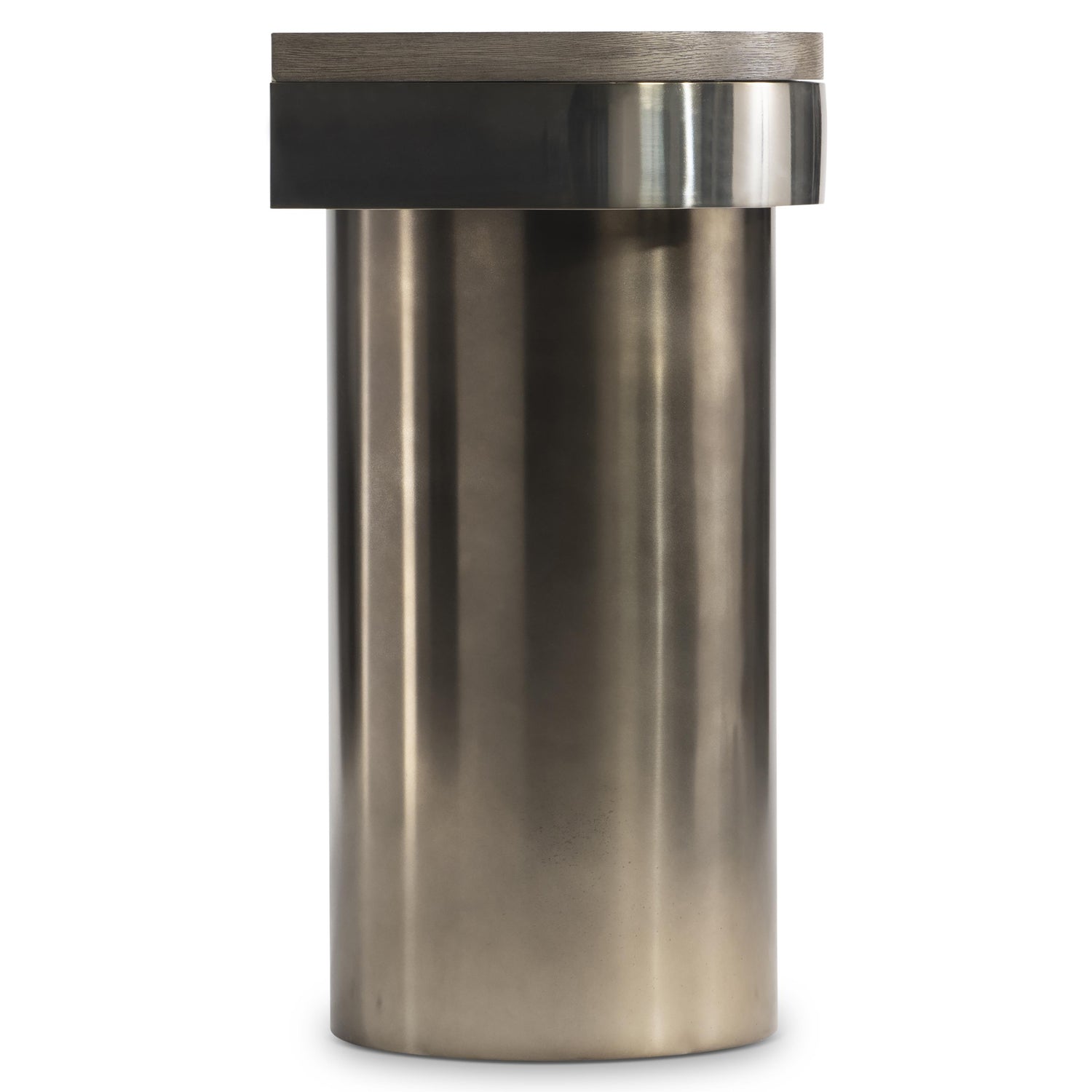 - Oak table top in Weathered Greige finish, framed by polished stainless steel in Light Bronze finish and supported by two round polished stainless steel pedestals in Dark Bronze finish