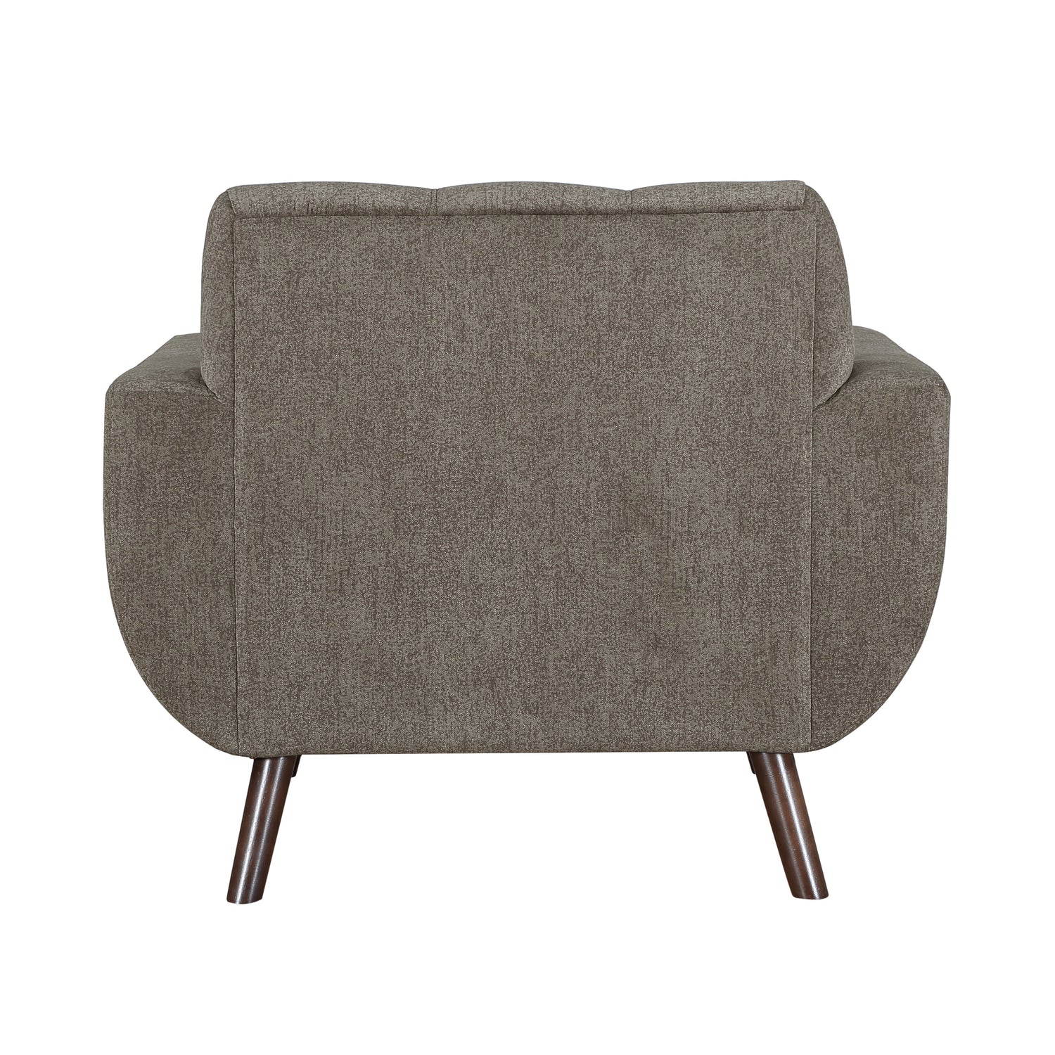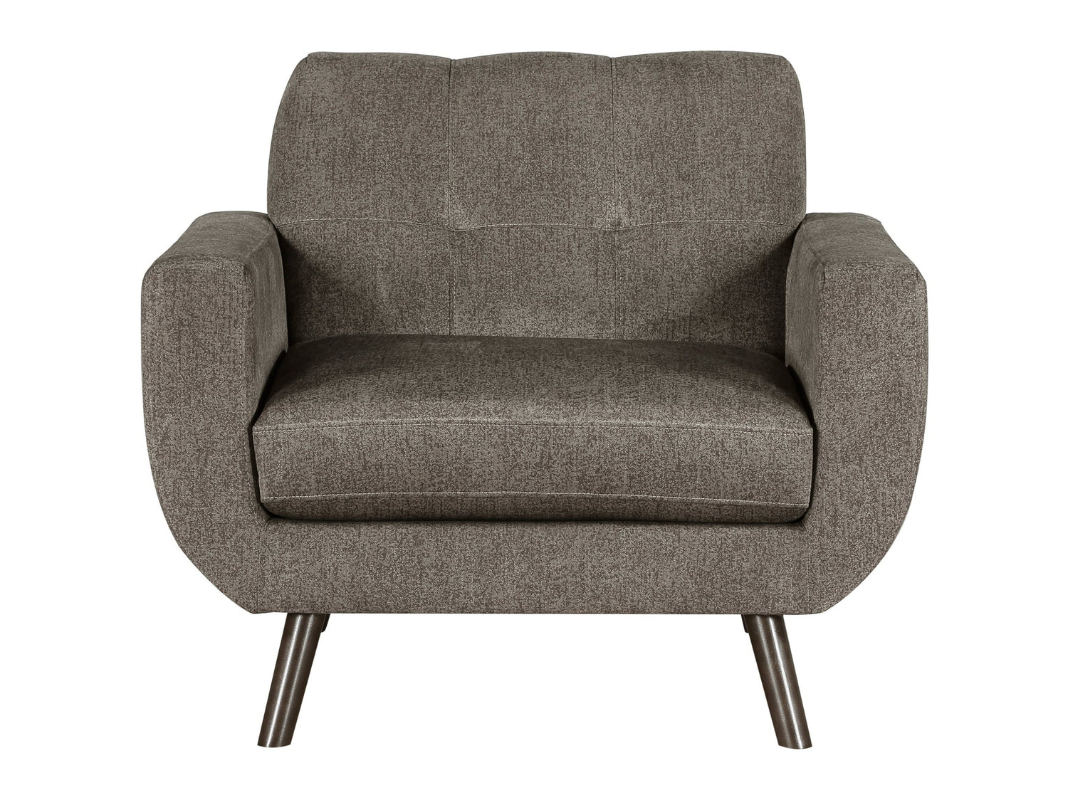 Timeless design never goes out of style, and the classic look of the Janne Collection follows the mid-century aesthetic of clean lines and modern sensibility. Brown, cafe-hued, textured microfiber upholstered fabric covers the retro-inspired frame of the chair with walnut-finished wood legs providing complementing accent to the group. Contour stitching lends scalloped detail to the seatback’s profile, and front, while the prominent framing of the collection’s arms solidifies the Mid-Century Modern look. The collection also features reversible seat cushions.
