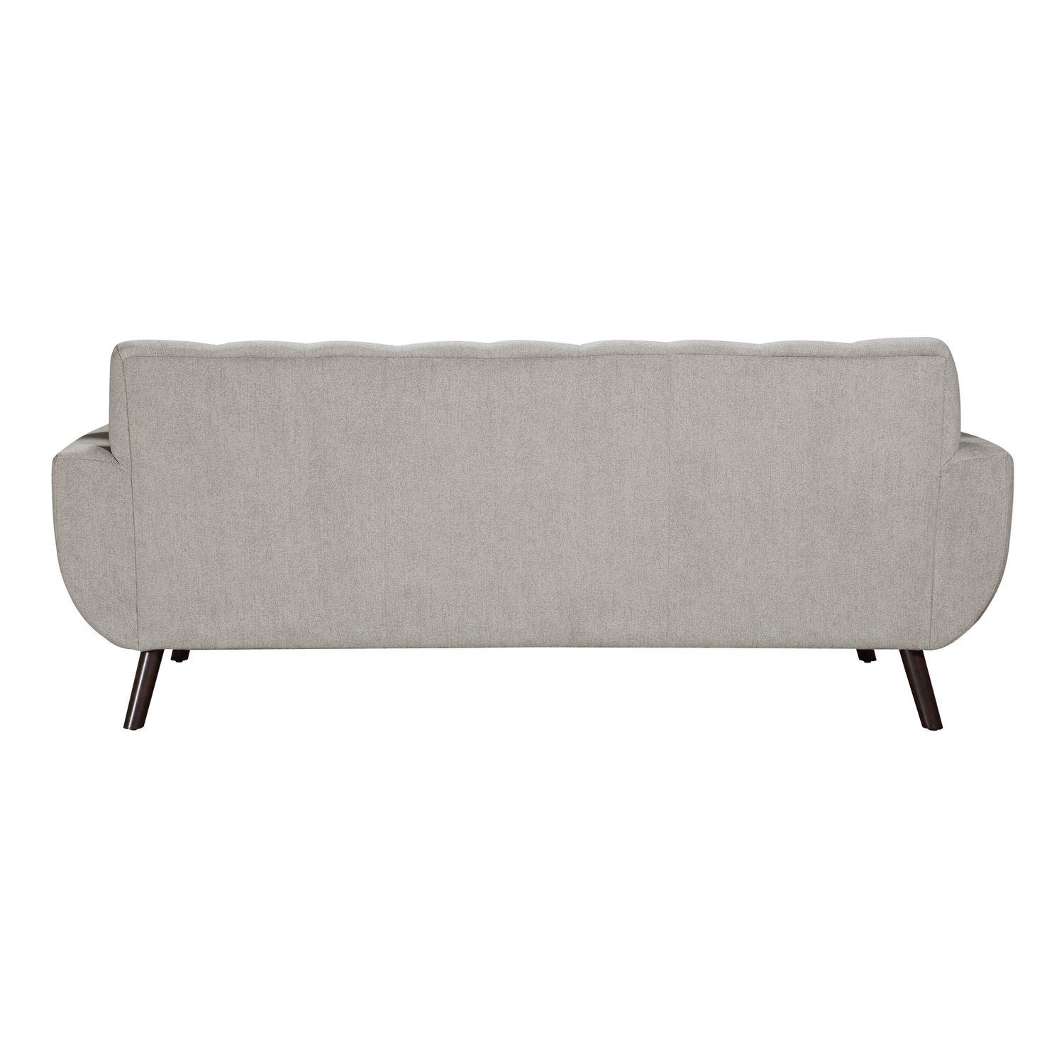 Timeless design never goes out of style, and the classic look of the Janne Collection follows the mid-century aesthetic of clean lines and modern sensibility. Tan textured microfiber upholstered fabric covers the retro-inspired frames of the sofa, with geometric print toss pillows and walnut-finished wood legs providing complementing accent to the group. Contour stitching lends scalloped detail to the seatback’s profile, and front, while the prominent framing of the collection’s arms solidifies the Mid-Century Modern look. The collection also features reversible seat cushions.