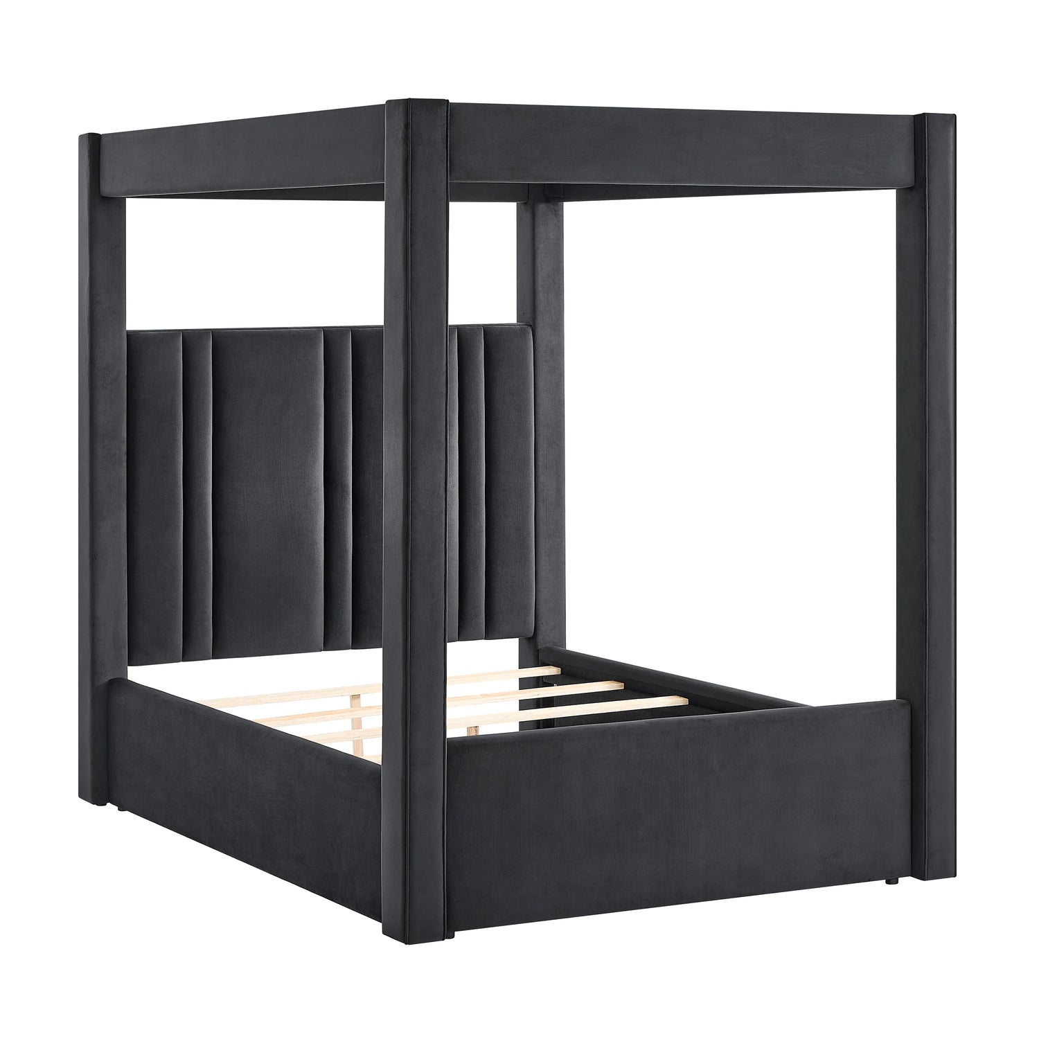 The Jayla Black King Canopy Bed is a king canopy bed constructed from upholstered fabric that provides a comfortable and enduring sleep space. Part of the Jayla Collection by Crown Mark, this bed is a defining piece for any bedroom. Its modern, clean lines are paired with a distinct canopy design, blending contemporary style effectively. The plush, velvety upholstery feels soft, inviting relaxation, while a sturdy structure ensures durability and stability. Designed for individuals seeking both high-end looks and lasting comfort, this bed brings a refined presence to any room. Please note, the nightstand and mattress are not included and are sold separately.