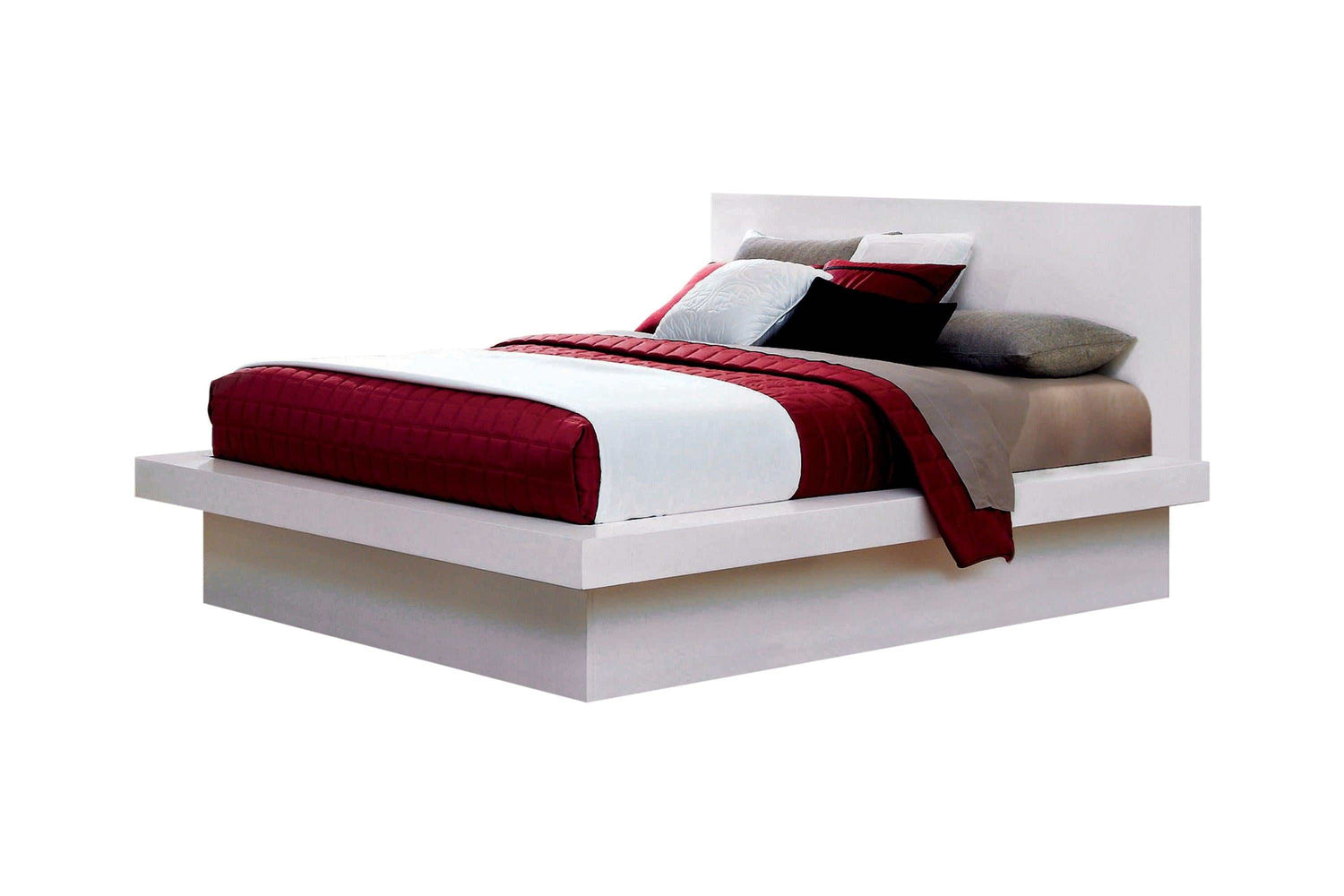 Modern eastern king size bed wrapped around a ledge on all sides, with nightstand, dresser, and mirror. Crafted from solid wood and covered in a white finish.