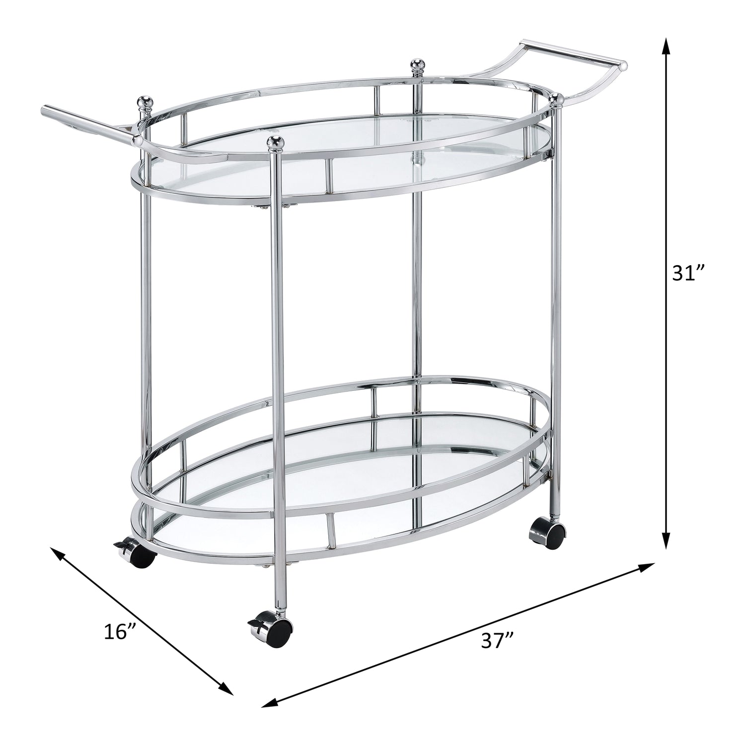 Instantly transform an ordinary room in to a minibar with this brilliant accessory. Two clear glass shelf allow you to display delicious drinks and delicate glassware. Supporting metal frame features a simplistic silhouette with chrome finish giving a modern touch. Two handle design and wheel stop make it easy to move around and place it where needed.