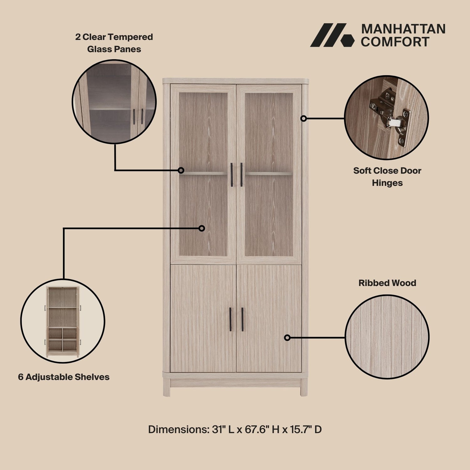 - 2 Soft Close Tempered Glass Panel Display Doors on Top and 2 Ribbed Manufactured Wood Soft Close Doors on Bottom.