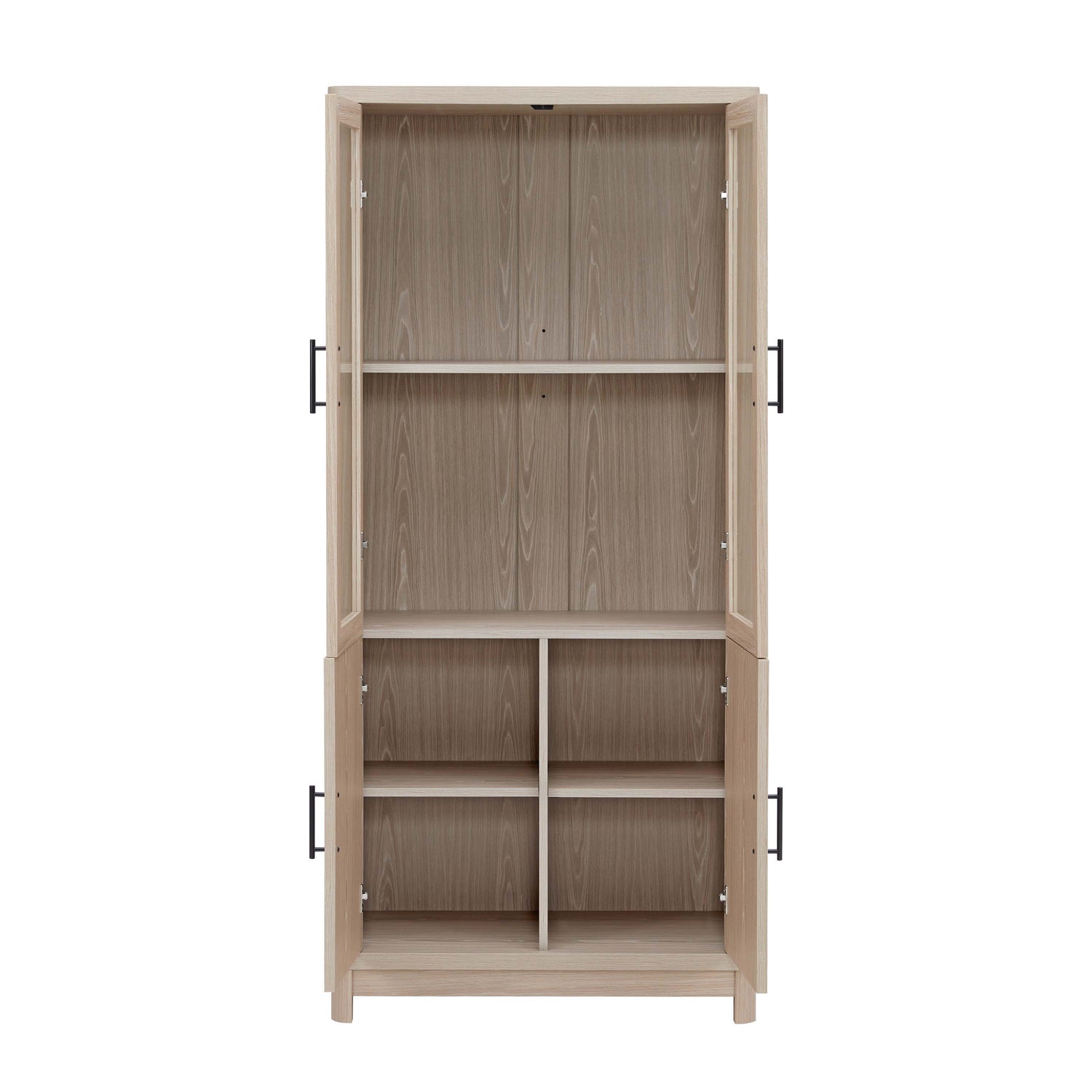 - Each Bookcase Includes 2 Soft Close Tempered Glass Panel Display Doors on Top and 2 Ribbed Manufactured Wood Soft Close Doors on Bottom.