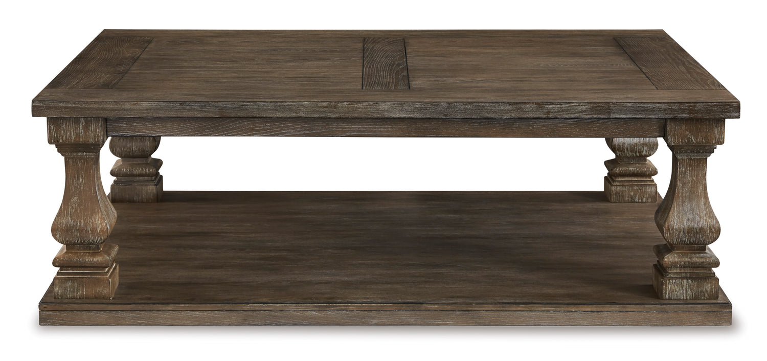 Homey. Hearty. Heavenly hued. Luring with a distressed weathered gray finish and square baluster legs set on a broad lower shelf for great presence, this coffee table is sure to make your homestead feel that much more like home. The look is beautified with elm veneers and a framed and plank-effect tabletop for a richly crafted masterpiece made for years of satisfaction.