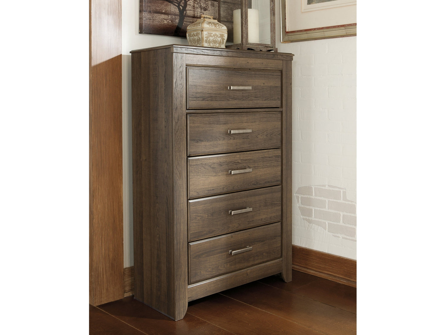 Get the look of posh barn wood without setting foot in a salvage yard. Replicated rough-sawn oak of this chest of drawers has a vintage finish that is reminiscent of a timeworn family heirloom. Warm, rustic, and naturally beautiful, it’s just got that ageless appeal. Sleek, mod pulls in a pewter tone are a snappy finishing touch.