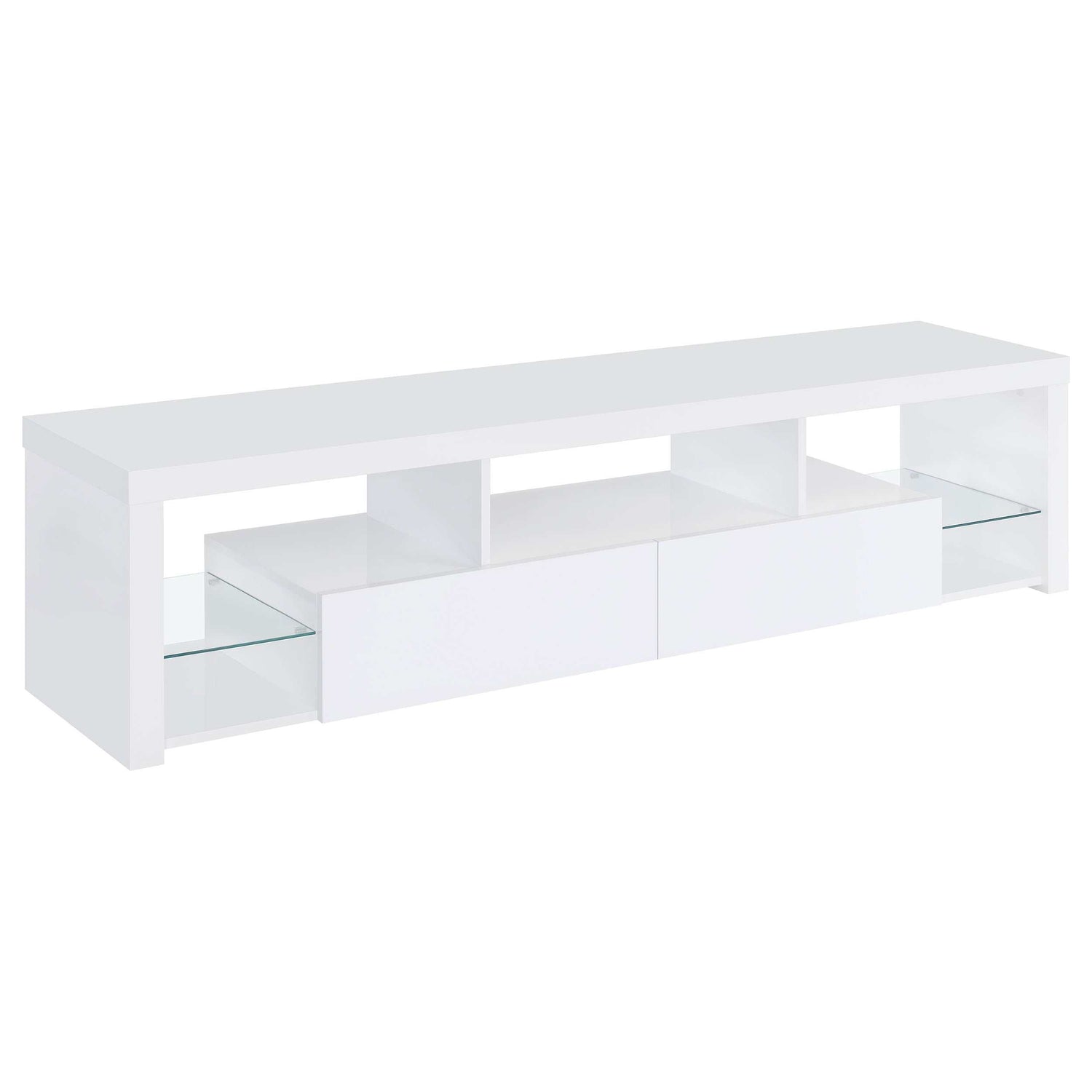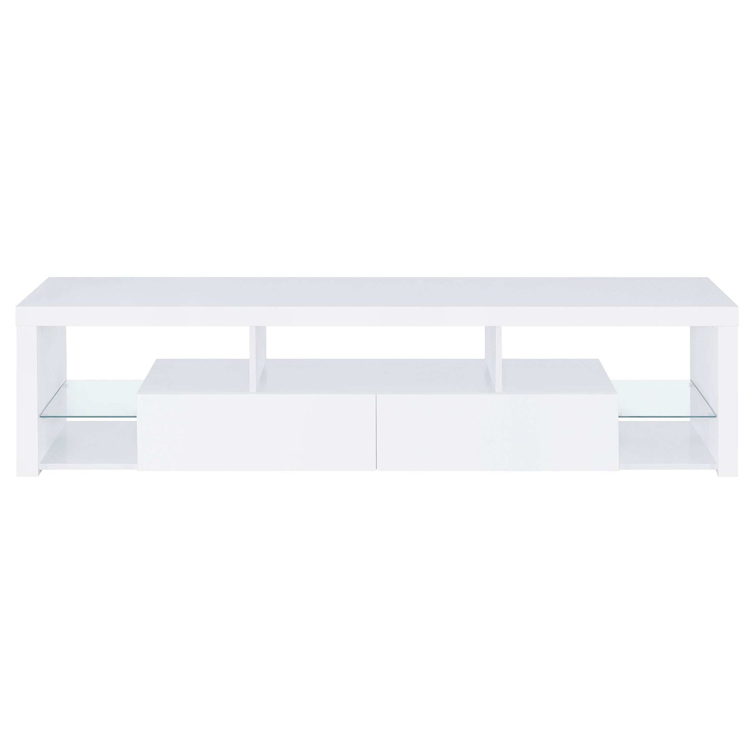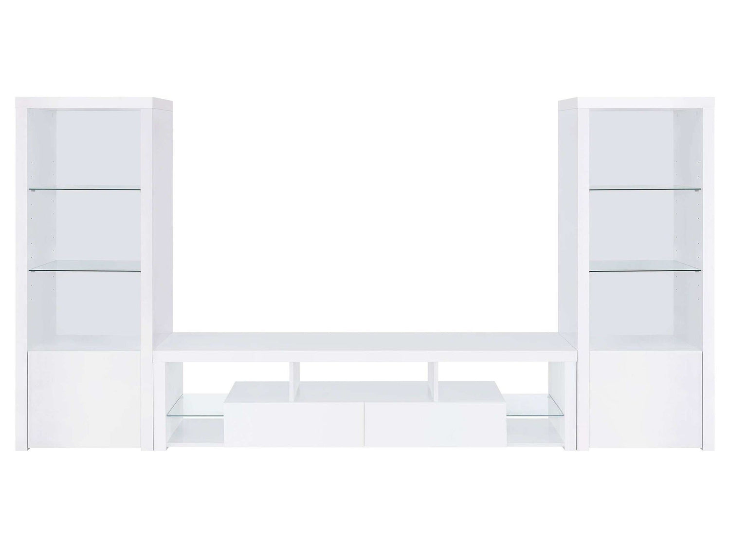 Elevate your entertainment arena with our sleek, modern TV stand. Drenched in a pristine glossy white-on-white finish, it radiates sophistication, accentuated by clear glass details. Its soft-close drawers ensure smooth operation, while glass shelves present a chic display option. Generous storage compartments cater to all your media needs. To enhance the ensemble, the set comes with matching media towers, amplifying storage capacity and offering a unified, stylish appearance. This combo not only meets functional demands but also serves as a captivating focal point in any contemporary space.