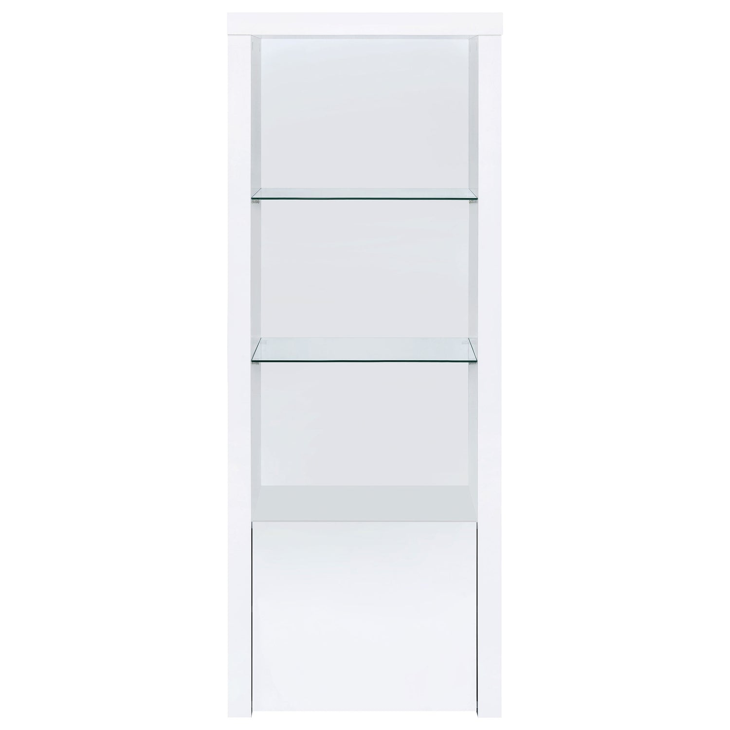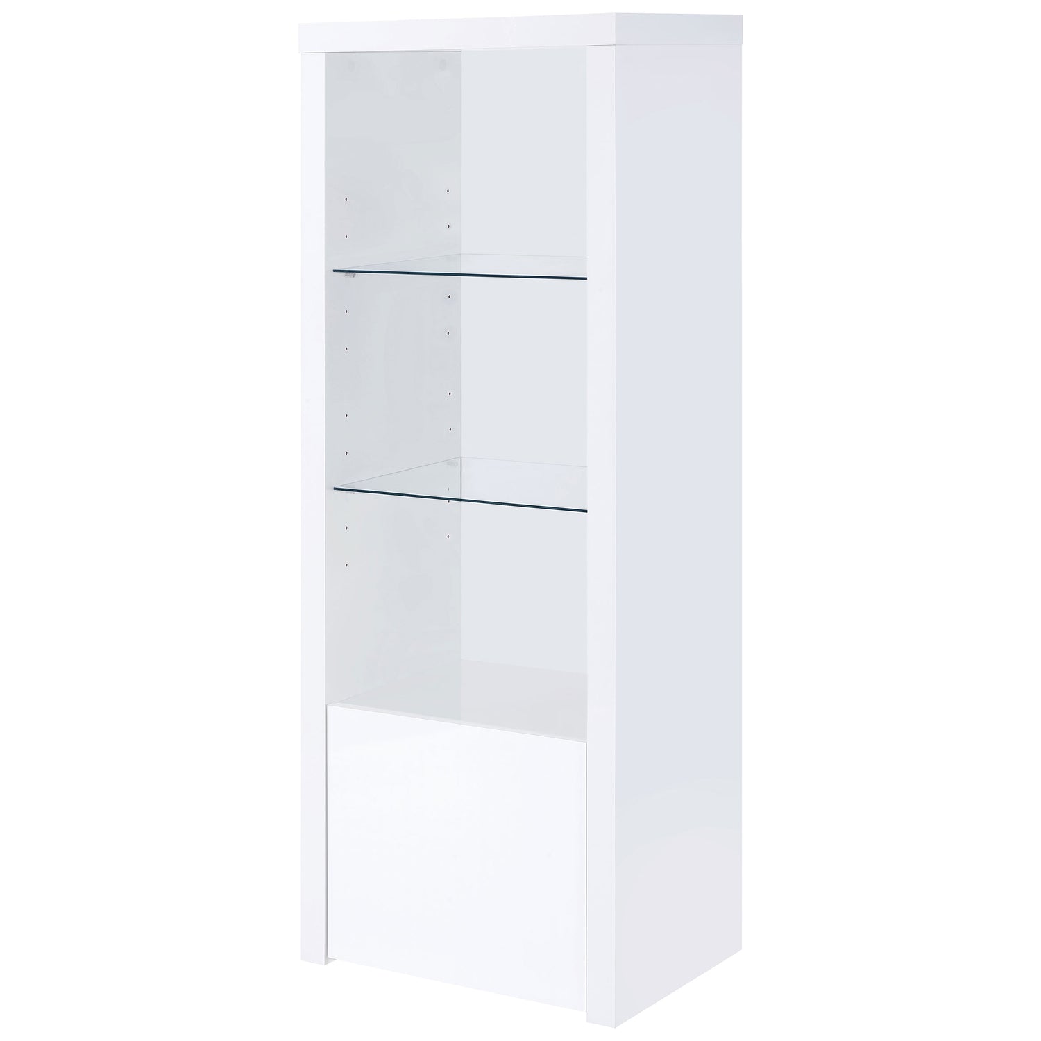 - Includes: One (1) media tower- Contemporary tower adds lower cabinet and glass display shelves
