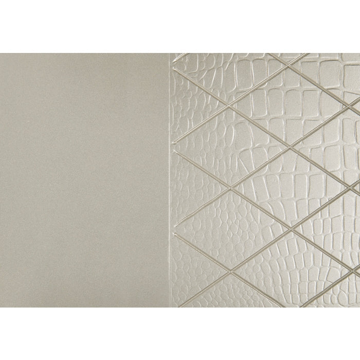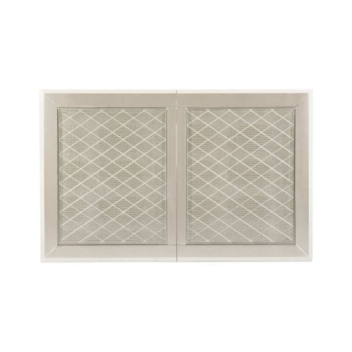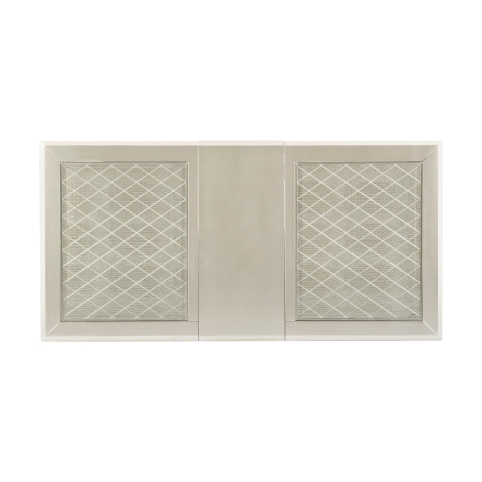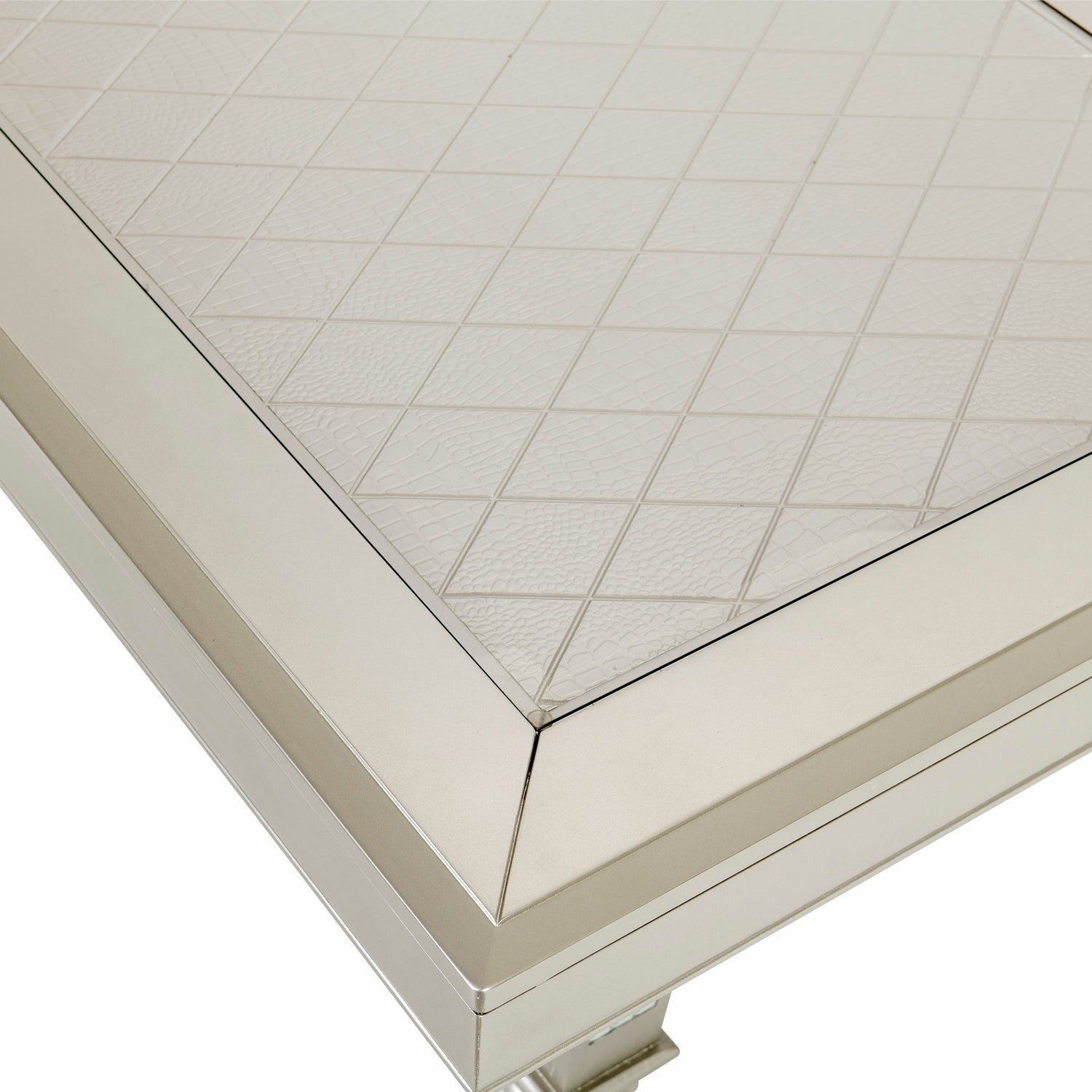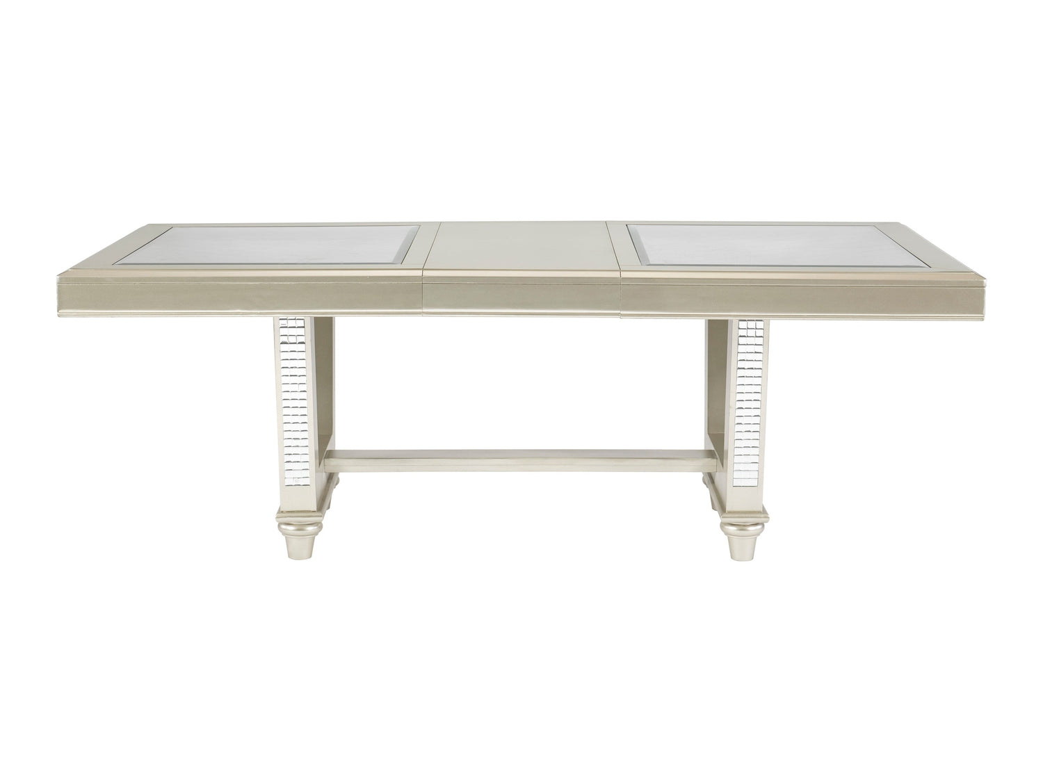 Radiating the iconic beauty of glamorous styling, the Juliette Collection is an elegant addition to your dining room. The silver finish of the collection is reflected in the mirror trim that defines the profile of the pedestal tabletop and base. Inset glass panels top the table, their presence serving to display the embossed and diamond patterned surface. Turned feet lend subtle traditional accent while the decorative elements create the glamorous aesthetic.