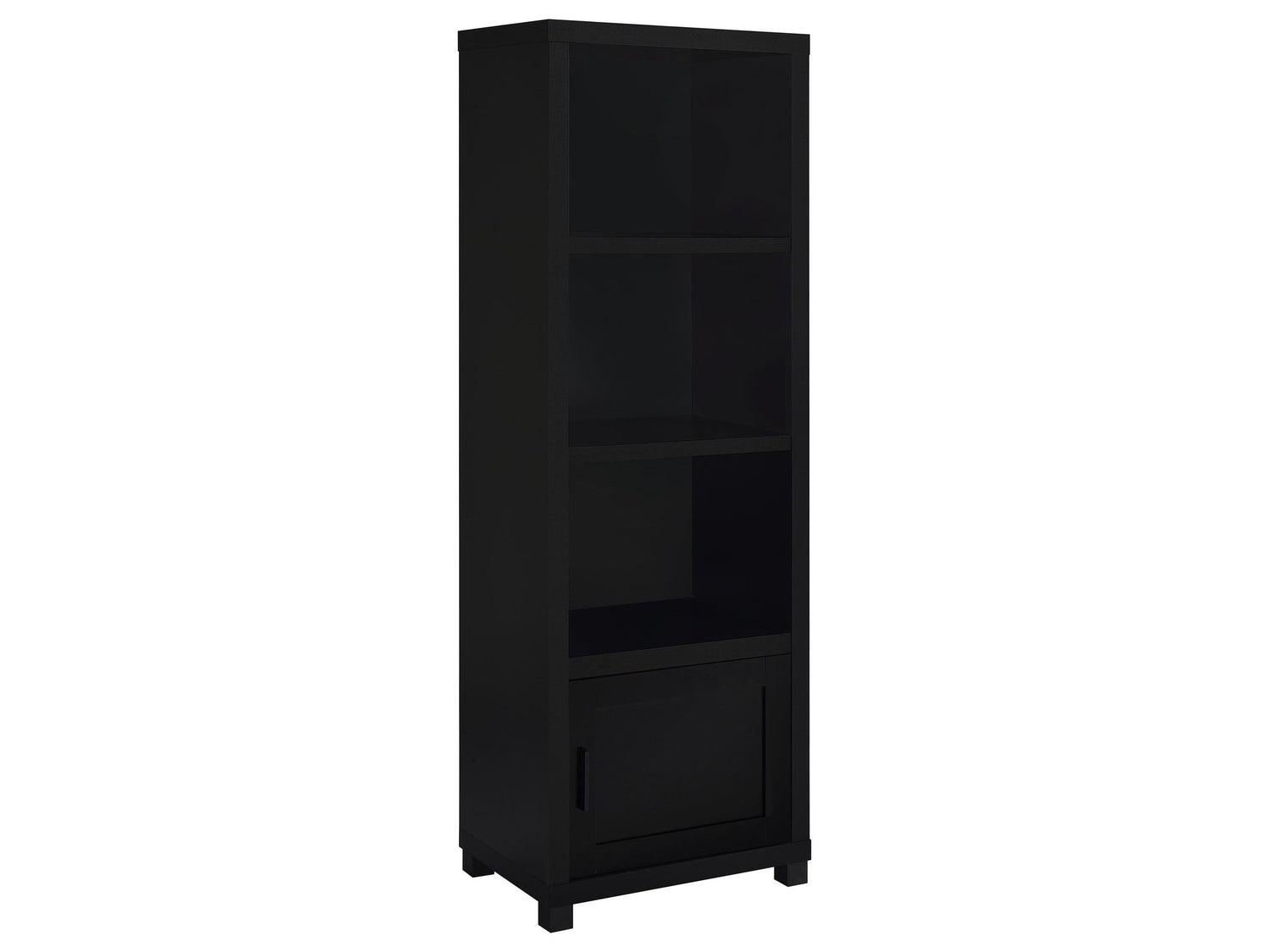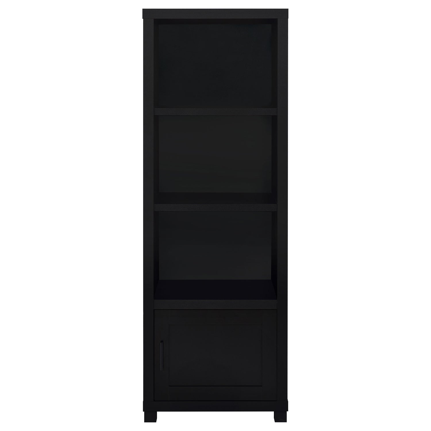 - Includes: One (1) media tower- Media tower with three tiers of open shelving for books, media, and display items