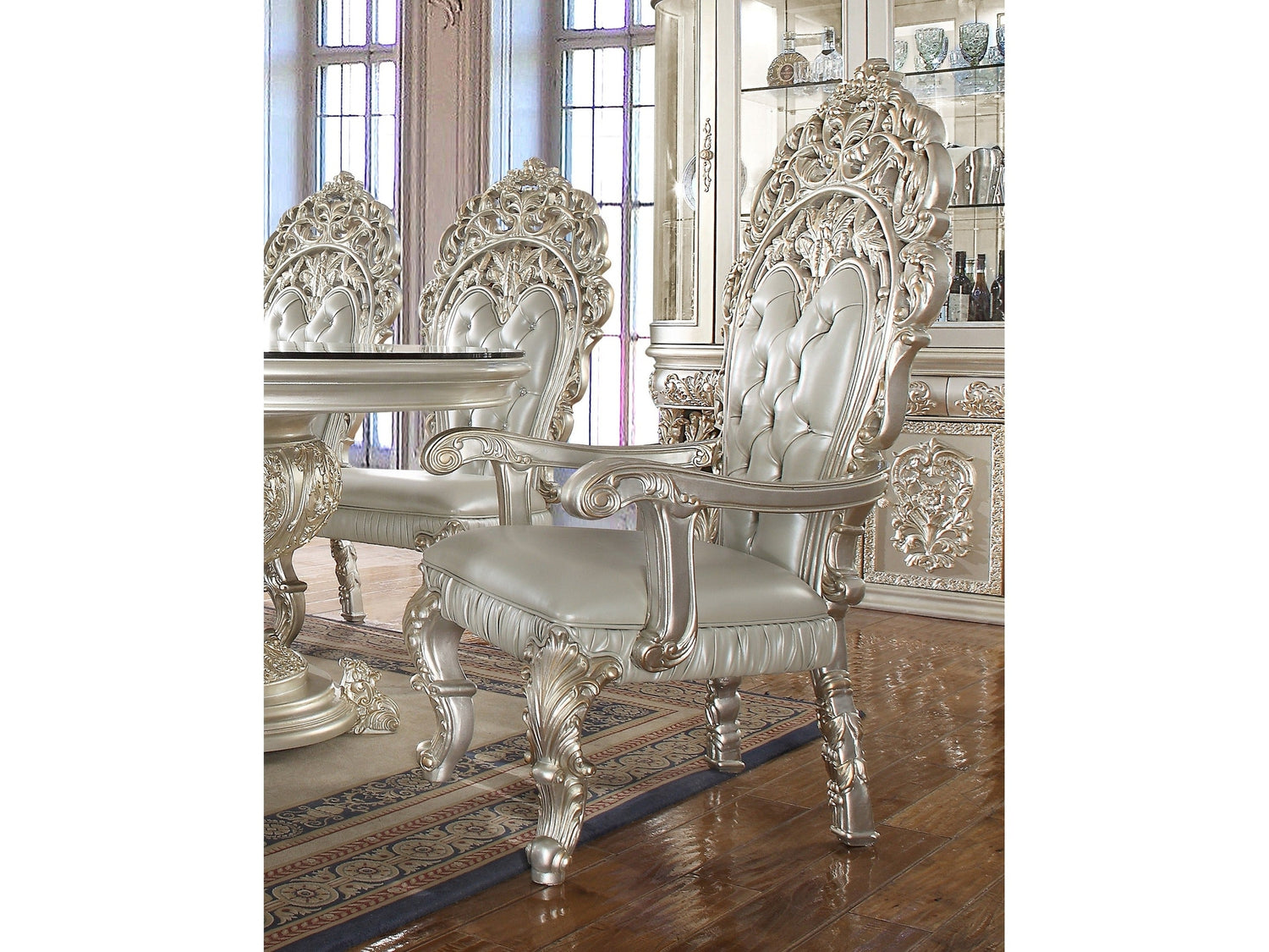 Dine like royalty while sitting in these tall back, intricately carved HD-8088 chairs. Finished in a metallic silver with gold highlighting that accentuates the silver leather seating areas and carved feet, these chairs are impressive to say the least!
