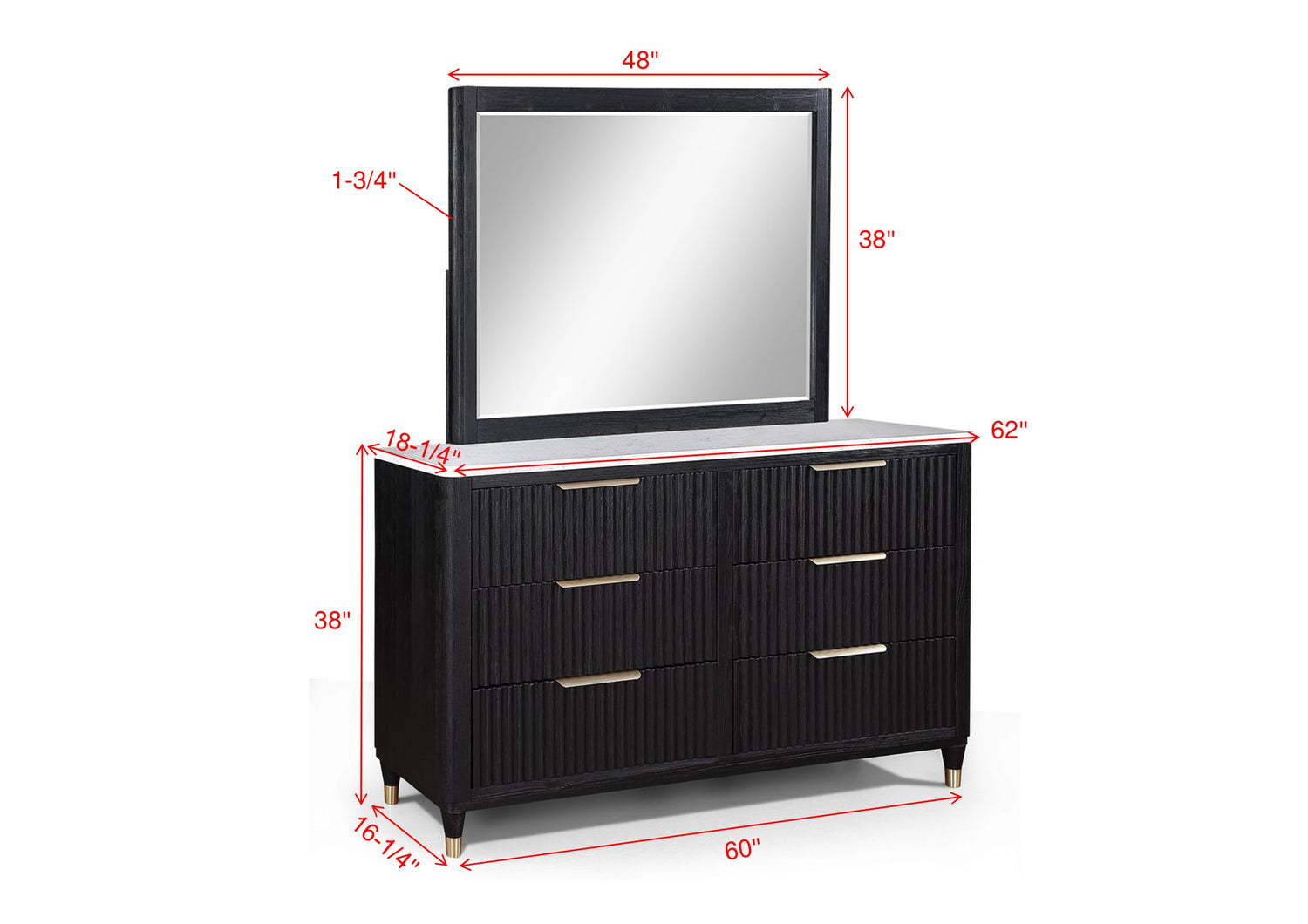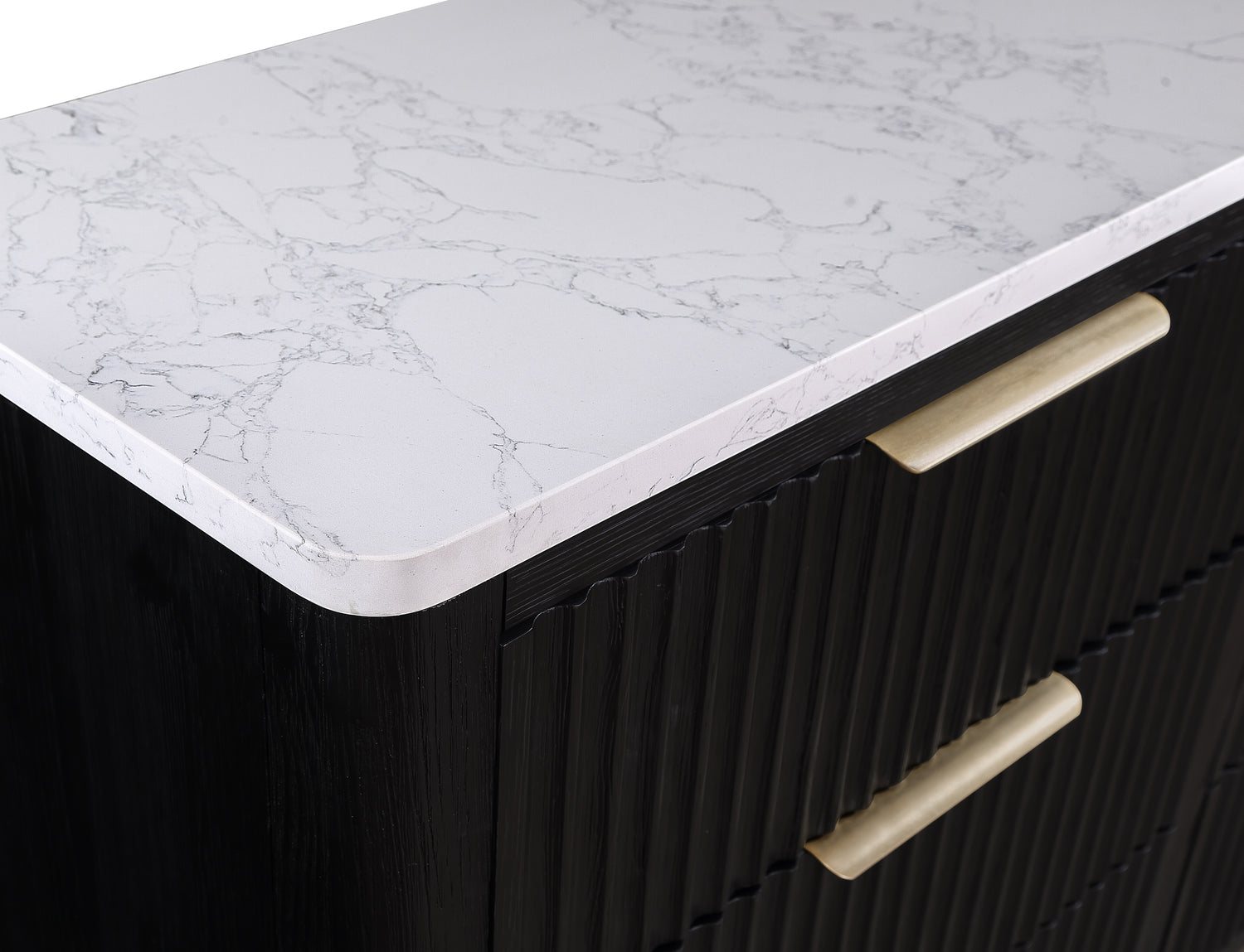 The Kara Black Panel Bedroom Set offers a striking balance of style and sophistication. Its bold black finish and contemporary silhouette create a sleek, refined atmosphere, while the upholstered headboard and footboard add a soft, elegant touch. Designed with simplicity and harmony in mind, this collection includes beautifully coordinated case pieces with engineered stone tops and brass-accented hardware that complete its modern aesthetic. Perfect for transforming your bedroom into a luxurious yet understated retreat.