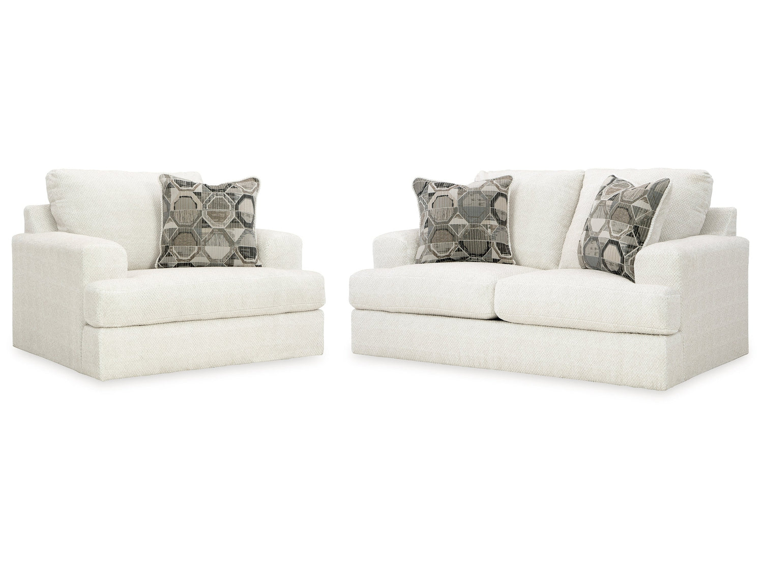 Craving casual refinement? This loveseat and chair set has you covered. Its decidedly contemporary frame cradles sizable cushions in an ultra-soft neutral hue, lightening the mood in your living room with simple style and everyday comfort. Solid and geometric accent pillows perfect the chic-meets-cozy vibe.