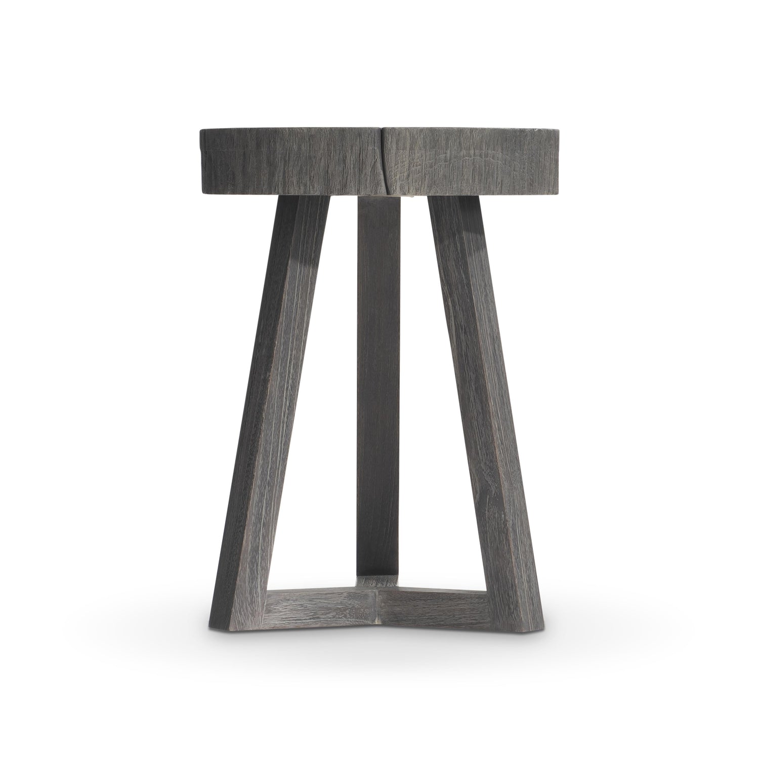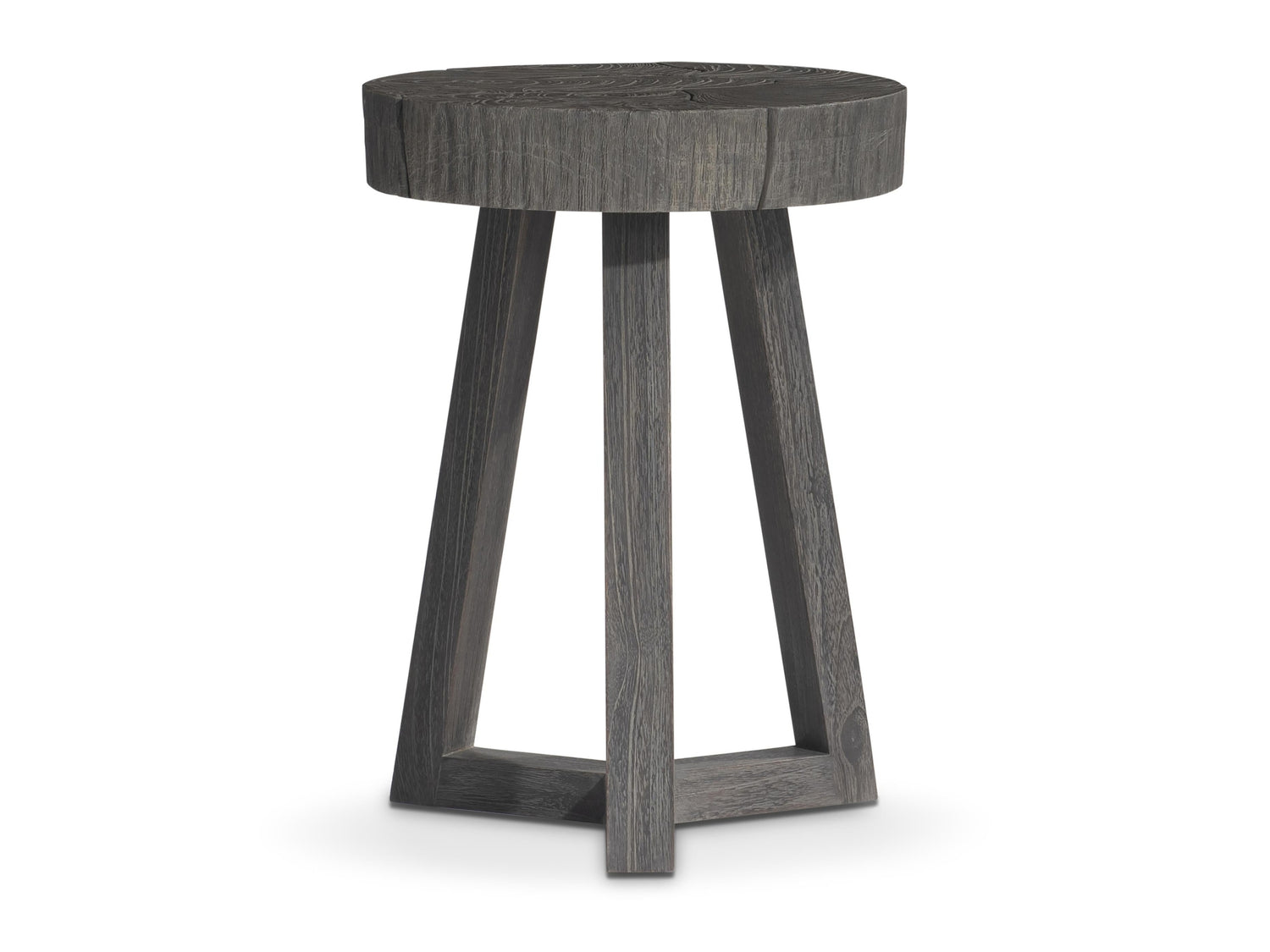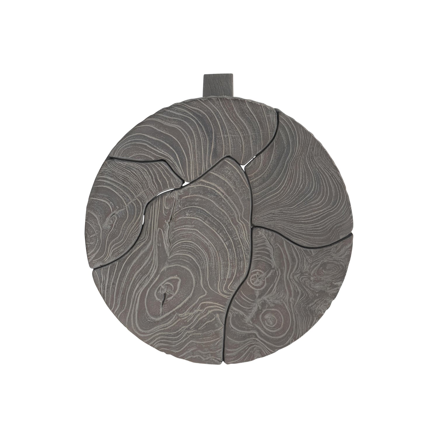 - Table top created with slices of teak fitted together like a puzzle, atop teak base of two intersecting triangles, all in Smoked Truffle finish