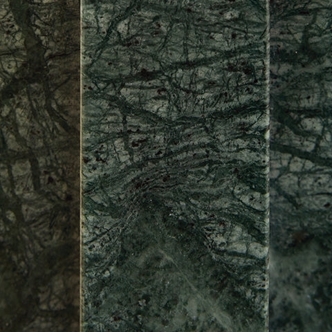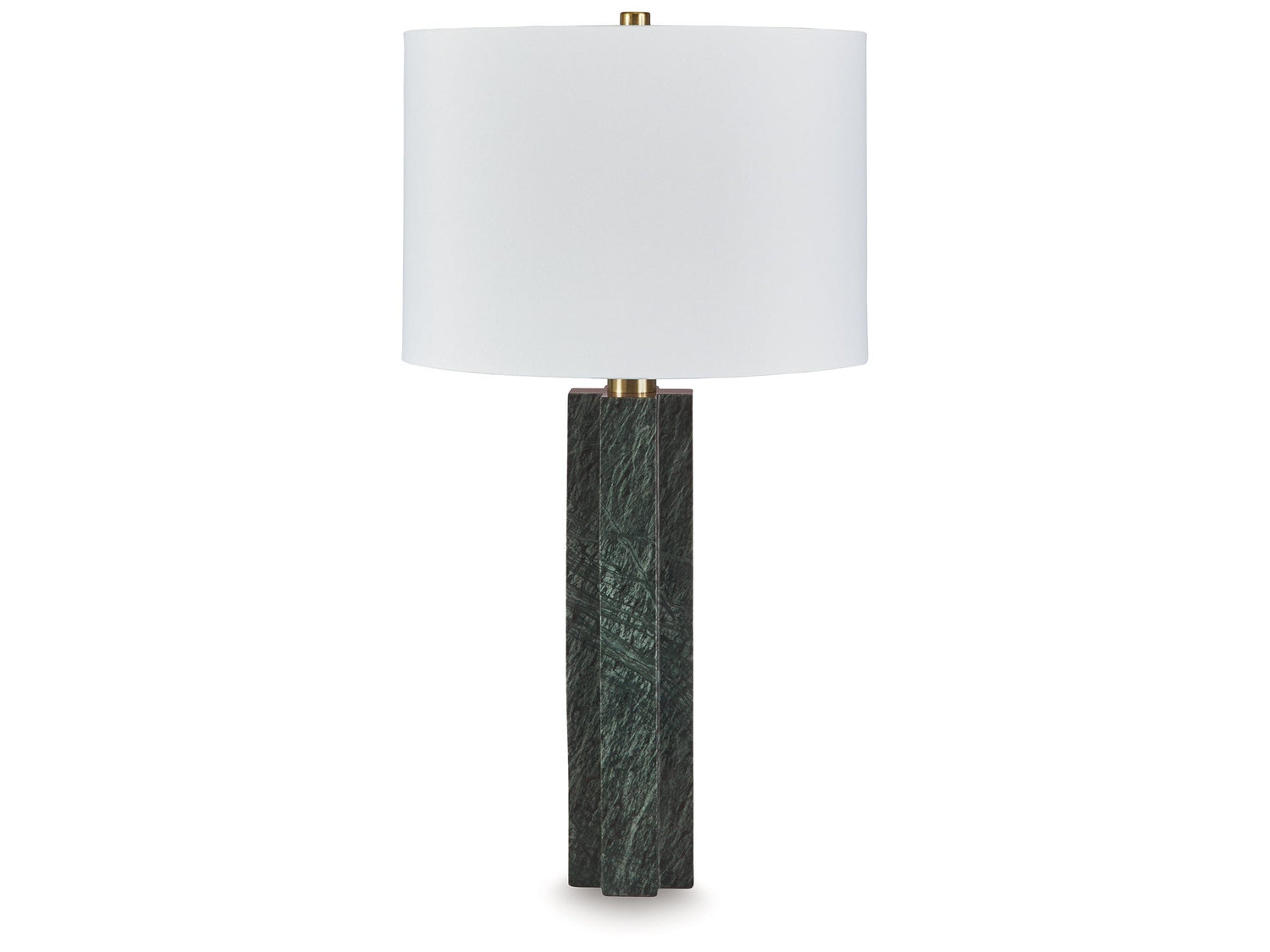 - Made of green marble and metal with drum hardback fabric shade- Goldtone accents