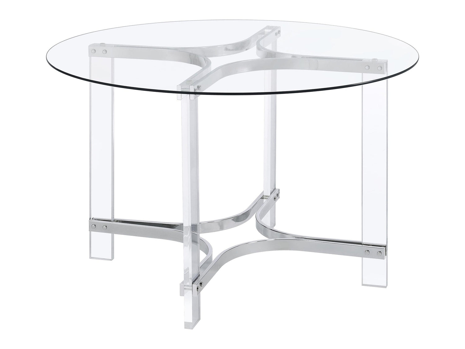 Center your dining experience on a chic, modern round dining table with sculptural appeal. It boasts four straight clear acrylic legs with four-point star bases that create incredible stability. The gleaming chrome finish stands out, adding artistry to your kitchen or dining room. The table is topped with a round of clear glass, adding to its airy ambiance. This contemporary table comfortably seats four, perfect for a breakfast nook or compact dining room.