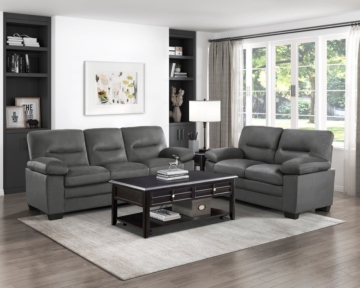 The sleek profile of the Keighly Collection will be the perfect complement to your modern living room. The love seat features a dark gray fabric cover for the ultimate decorative versatility, while pillow-top arms and plush seating create a platform that is perfect for your comfortable seated relaxation.