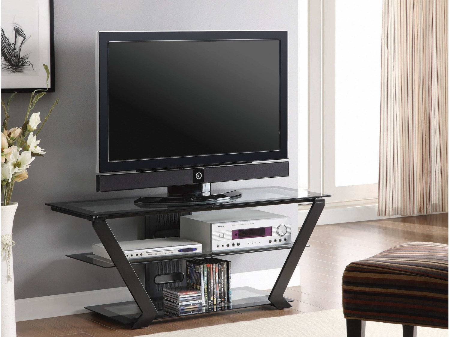 Entertain in style with the modern charm of this sleek TV console. Crisp, clean metal lines flare out into an eye-catching shape, giving it a contemporary look. A large tempered glass top and metal base provide security and stability for your valuable electronics. Two convenient lower shelves offer even more storage space for your home entertainment needs. This console is sure to upgrade the style of any modern living room.
