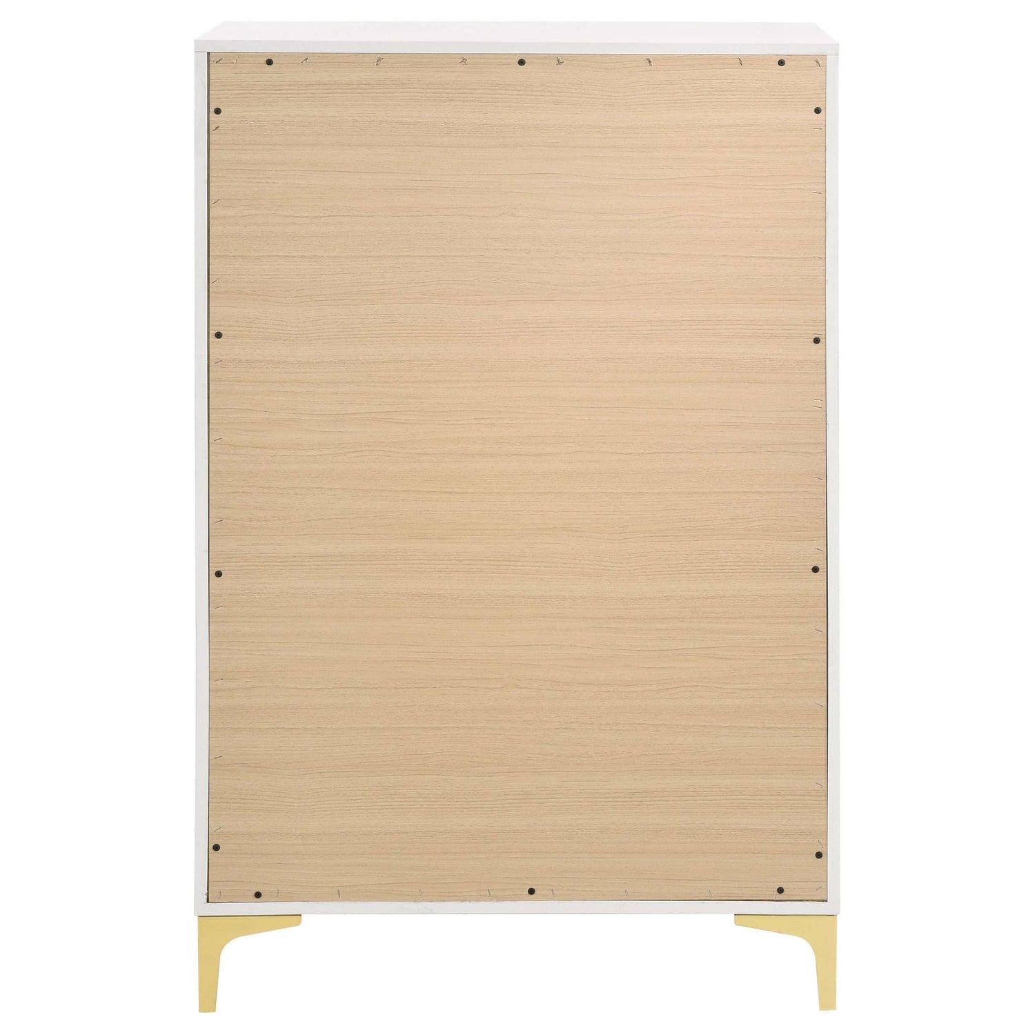 Open up your tight bedroom floor plan with this stately modern glam chest. Five spacious drawers stacked on top of one another keep garments and bedroom essentials stowed away and organized, helping you find what you need fast. A bright, white finish offers a sleek elegance, set off by warm golden accents. Along each of the five drawers is a slender gold finished pull, matched by the golden bracket legs that lift it up. Place this stunning five-drawer chest in your bedroom for an elegantly understated contemporary aesthetic.