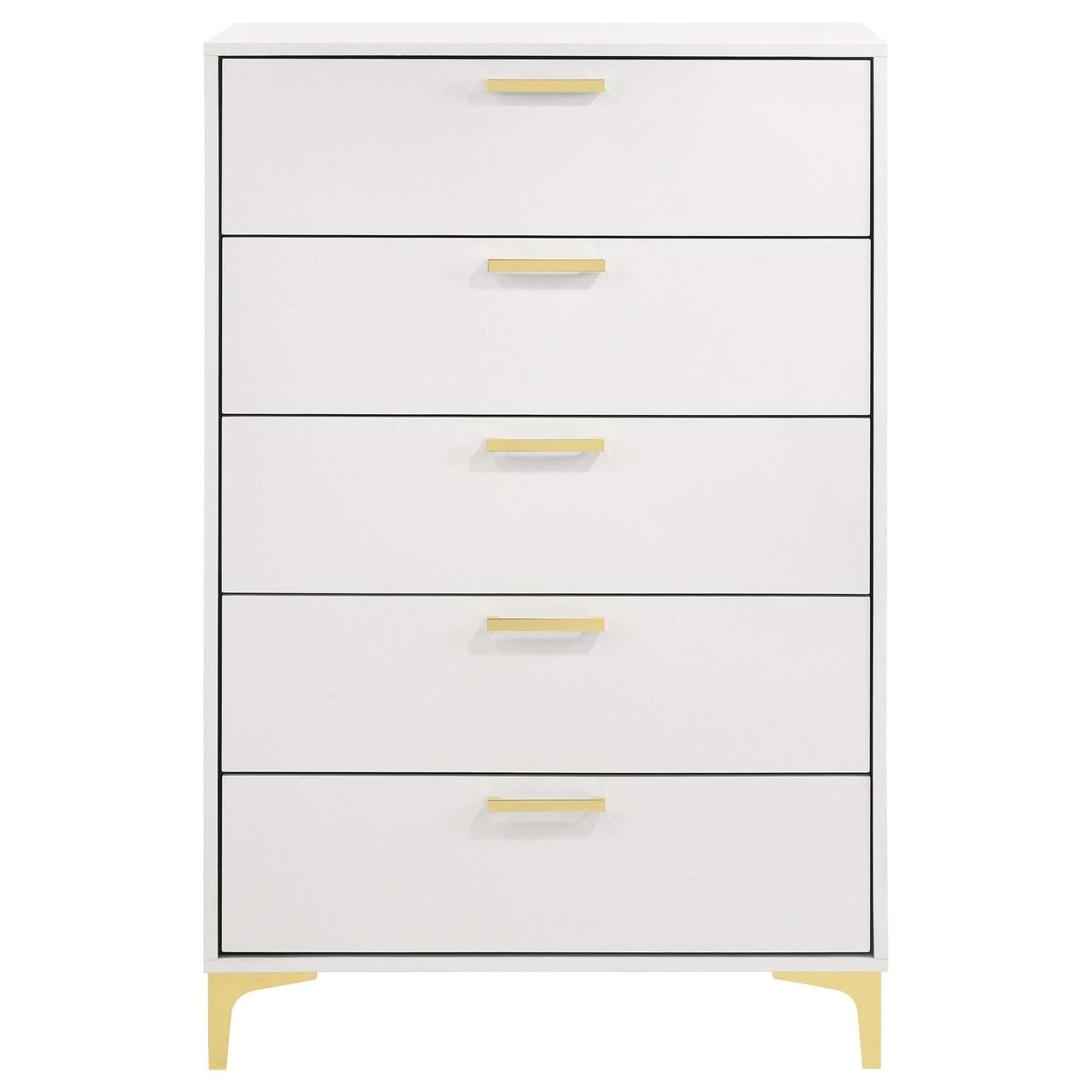 Organize garments, bed linens, and much more in this modern glam chest. Space-saving and tall with a simple, boxy frame, this five-drawer chest keeps your bedroom floor space open and free. A smooth, black finish presents a bold contrast and dramatic flair to focal walls and spaces. Each of the five spacious drawers is fastened with a chic, gold finished pull handle that lends a warm metallic accent. Bracket style legs mirror the golden metallic hues, offering a slight elevation and extra support to this stunning modern five-drawer chest.