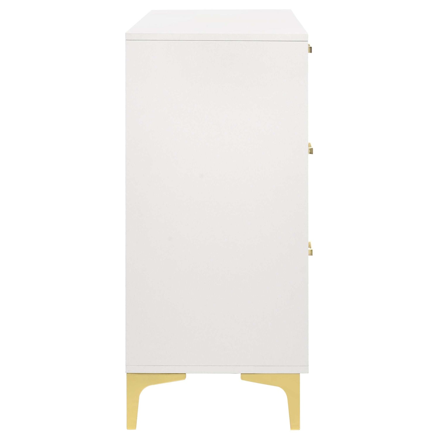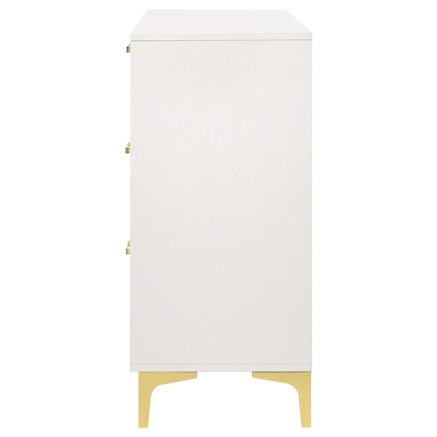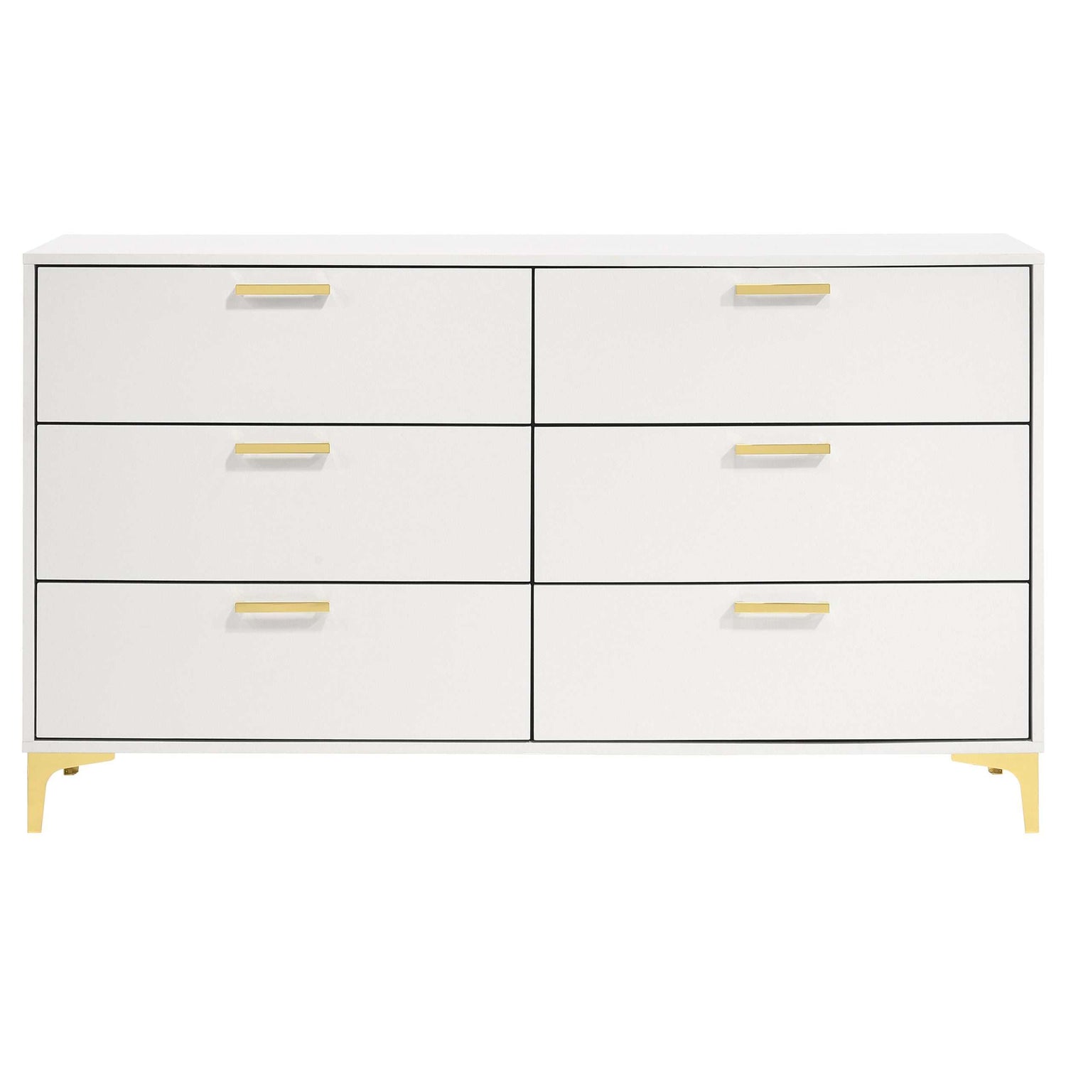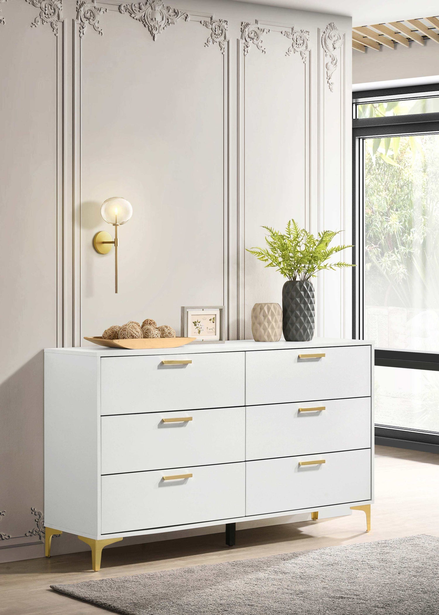 Maintain a cheerful and luxe bedroom with this splendid modern glam dresser. A perfect statement piece for contemporary bedrooms, this six-drawer dresser presents a light and airy expression. Accented with gold finished drawer pulls and bracket style legs, a luxe vibe shines through. The crisp, white finish maintains a sleek, dignified presence as well. Long and narrow, this dresser makes a lovely addition to your bedroom's focal wall and grounds a vanity dressing area.