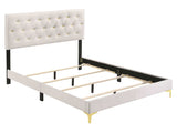 Create your glamorous bedroom retreat with this elegantly modern platform bed. A rectangular headboard with diamond button tufted details invites you to lean back and unwind each night. Shiny, gold finished bars make up the buttons, offering a sleek metallic touch. At the foot of the bed are gold bracket legs that bring a unified look. A bright, white leatherette fabric lends a soft and supple feel against the skin.