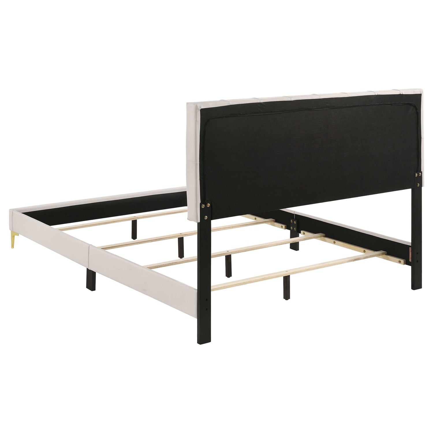 Create your glamorous bedroom retreat with this elegantly modern platform bed. A rectangular headboard with diamond button tufted details invites you to lean back and unwind each night. Shiny, gold finished bars make up the buttons, offering a sleek metallic touch. At the foot of the bed are gold bracket legs that bring a unified look. A bright, white leatherette fabric lends a soft and supple feel against the skin.