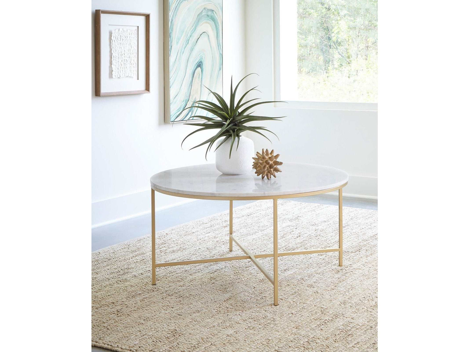 Sleek and stunning, this round coffee table is about to become a conversation piece. Beautifully handcrafted in India, the round white tabletop provides an eye-catching appearance in your living area. It's supported on slim yet stylish legs with a cross base. The gold finish of the legs makes a wonderful contrast with the tabletop. If only every end table offered such a simplistic design combined with elegant aesthetics.