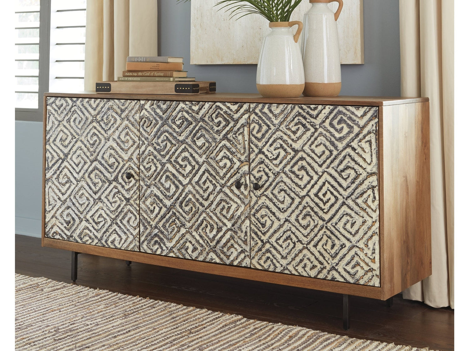 If you’re looking for a cool, clean-lined accent piece loaded with character, then you’ll surely want to carve out some space for this accent cabinet. Fabulous flush-mount doors wow with their carved Greek key design for added dimension and tonal contrast. Three interior shelves accommodate your storage needs.