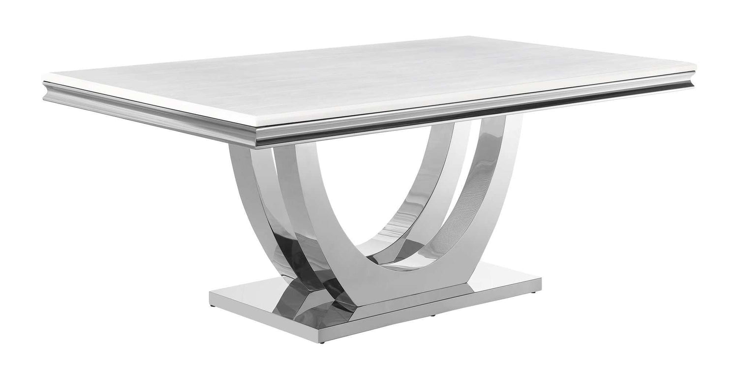 - A white faux marble tabletop keeps a classic and clean expression to your dining space