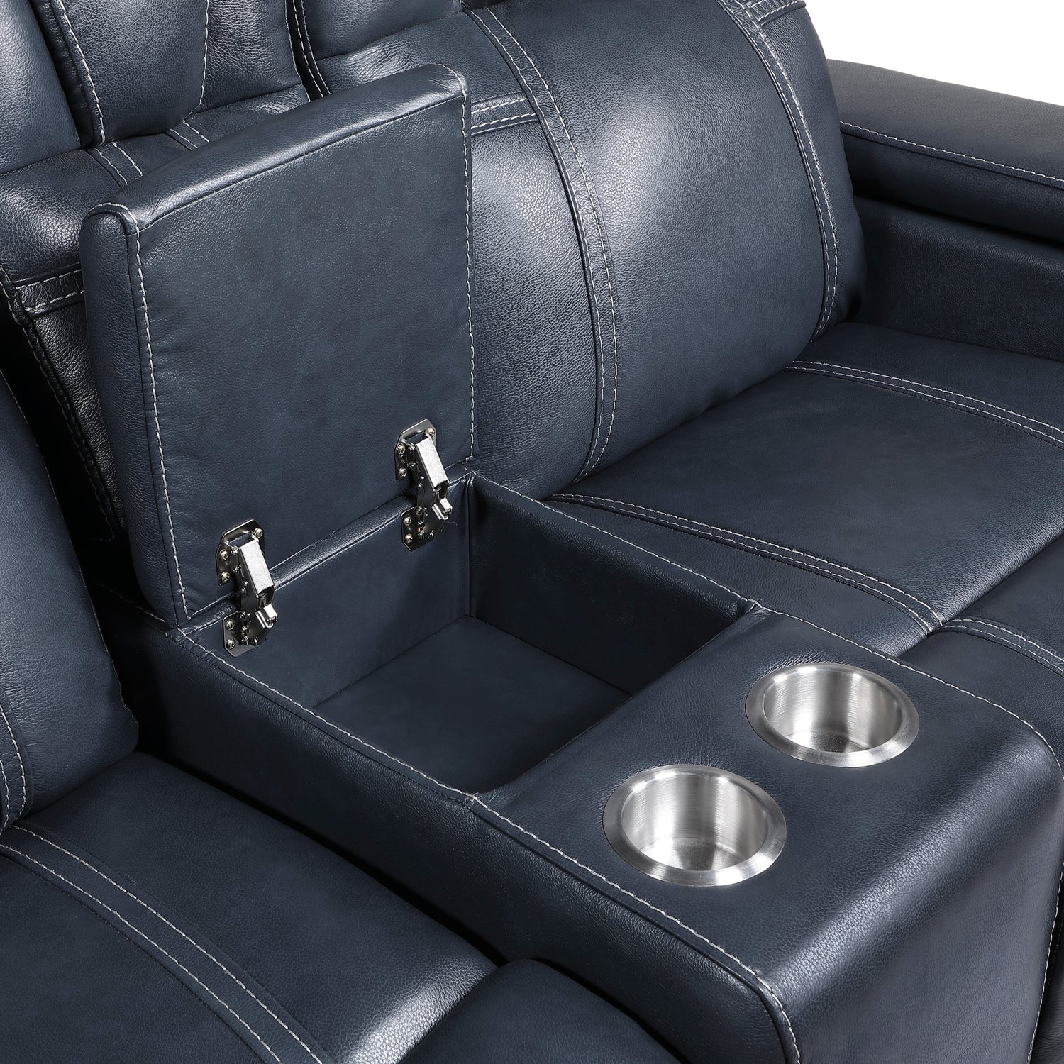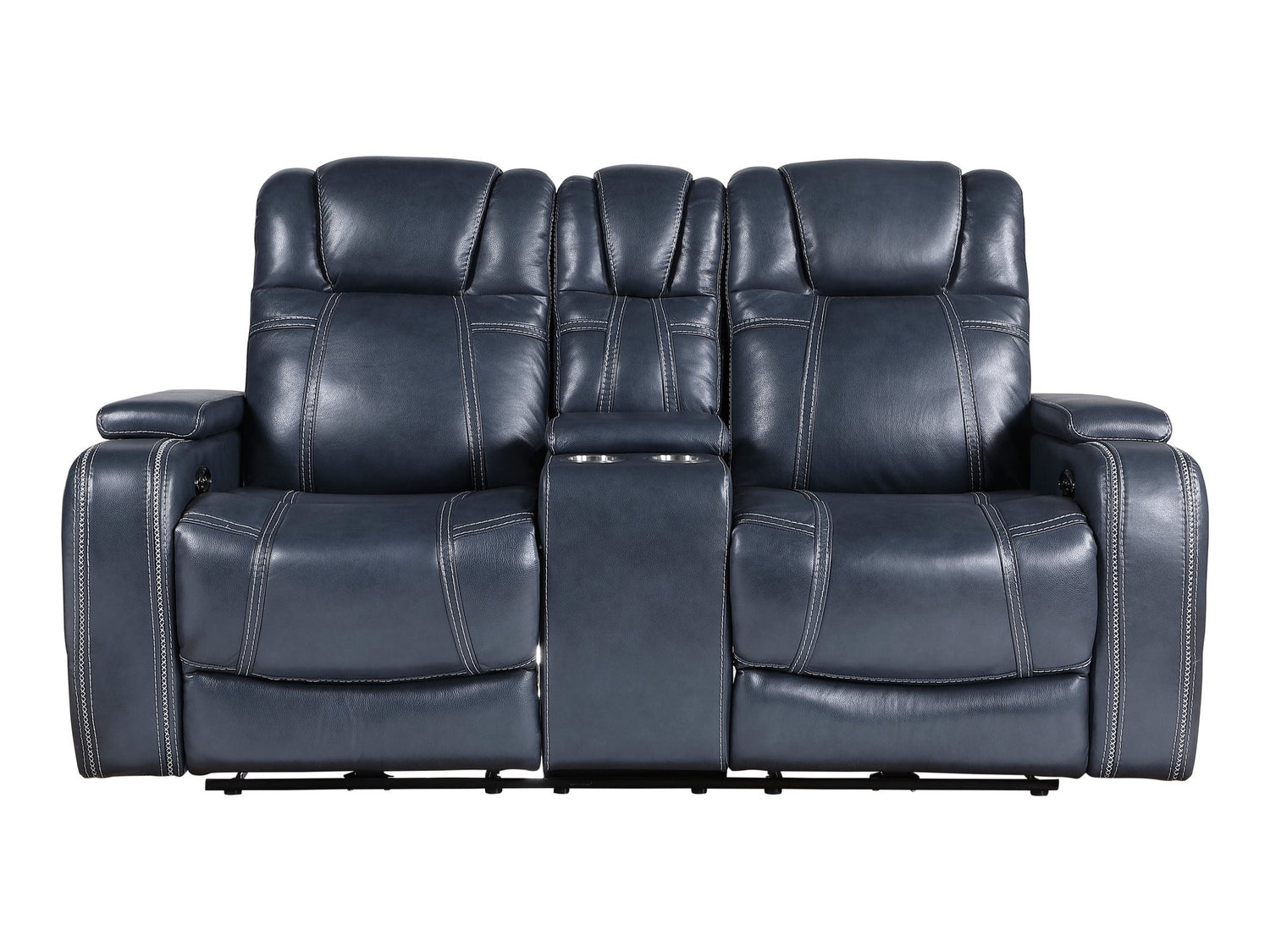An amalgamation of modern lines, comfort, and functional comfort, the Keziah Collection is a bold choice for your living room. The love seat has dual power motion mechanisms that allows for the extension of the footrests and headrests and are conveniently accessed with a touch of the side mounted one-touch control, while hidden armrests provide a convenient spot to place your remote control or electronic devices. The love seat’s console features hidden storage and cupholders. Further enhancing your comfort is the 100 percent top grain leather cover - where the body touches, with faux leather-match everywhere else – its blue hue adding bold accent to your living room’s décor.