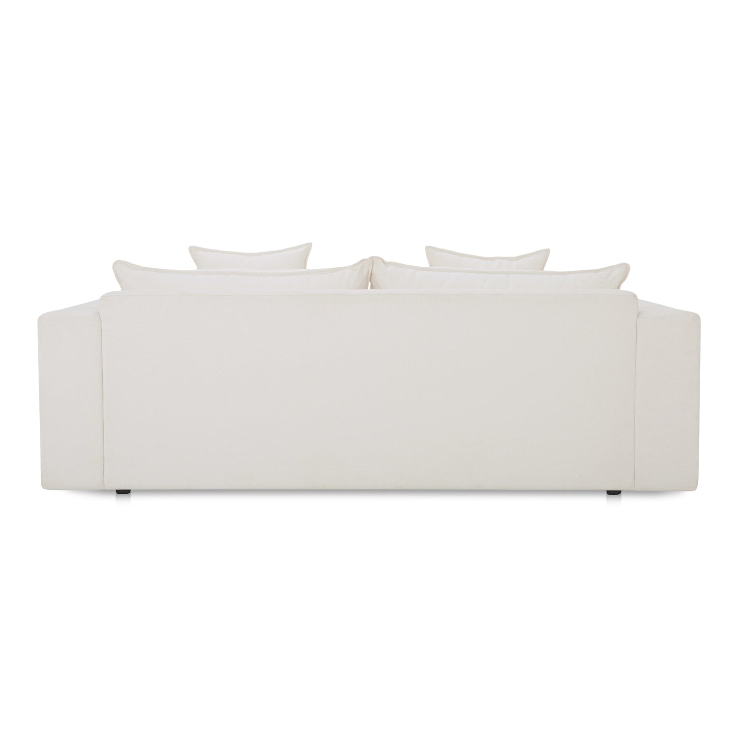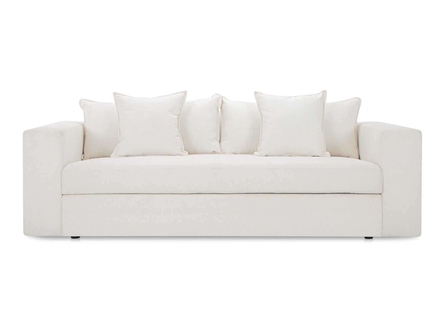 - Textured fabric upholstery with foam & fiber fill cushions, fiber wrapped seat, & two toss cushions
