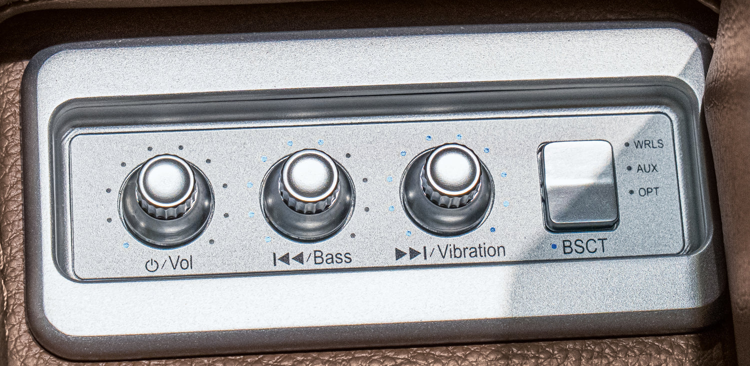 - hidden Thunder control panel with adjustable volume, bass and vibration knobs