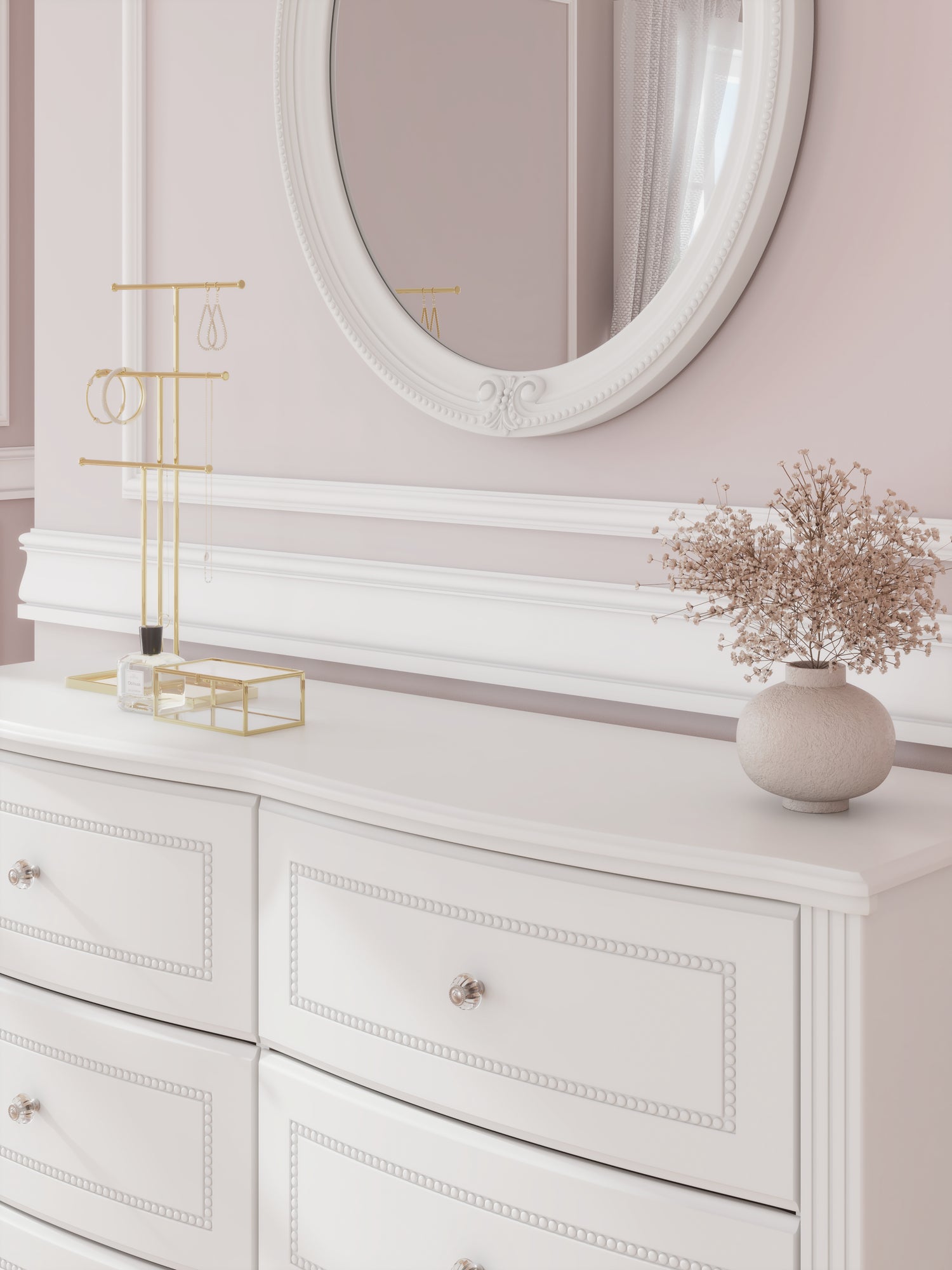 Kozlani White Full Upholstered Panel Bed, Dresser and Mirror