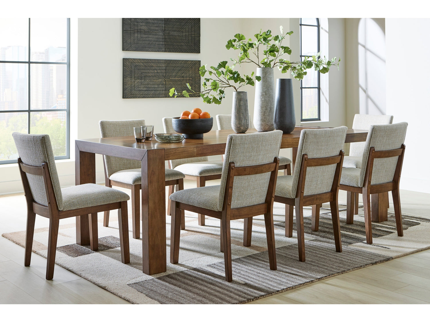 Experience worry-free living with this dining package. Designed to effortlessly blend casual and refined aesthetics, the rich brown butcher block veneer exudes a modern, relaxed vibe you'll love. And the washable Next-Gen Nuvella™ performance fabric handles life's little messes with ease. Styled to comfortably seat eight, this set makes room for one and all.