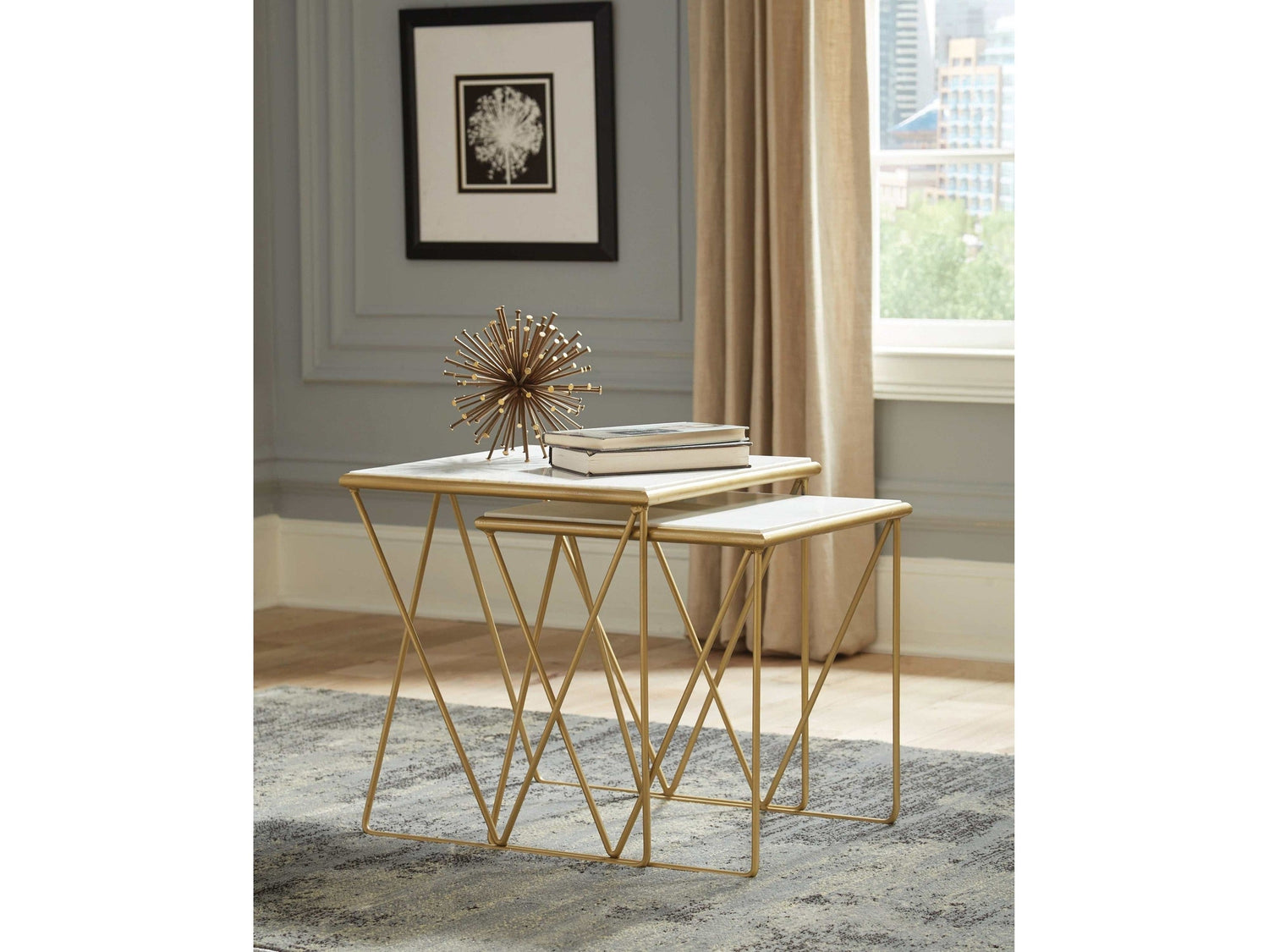 The perfect marriage of contemporary and classic, these modern nesting tables feature a rectangular silhouette. Clean lines are elevated with a white marble top. Sleek and elongated, the metal base features a metallic gold finish. Smooth and elegant, the open base is full of angled lines that bring a sophisticated feel to any living room. Combine rich texture with clean lines to elongate a space with luxury.