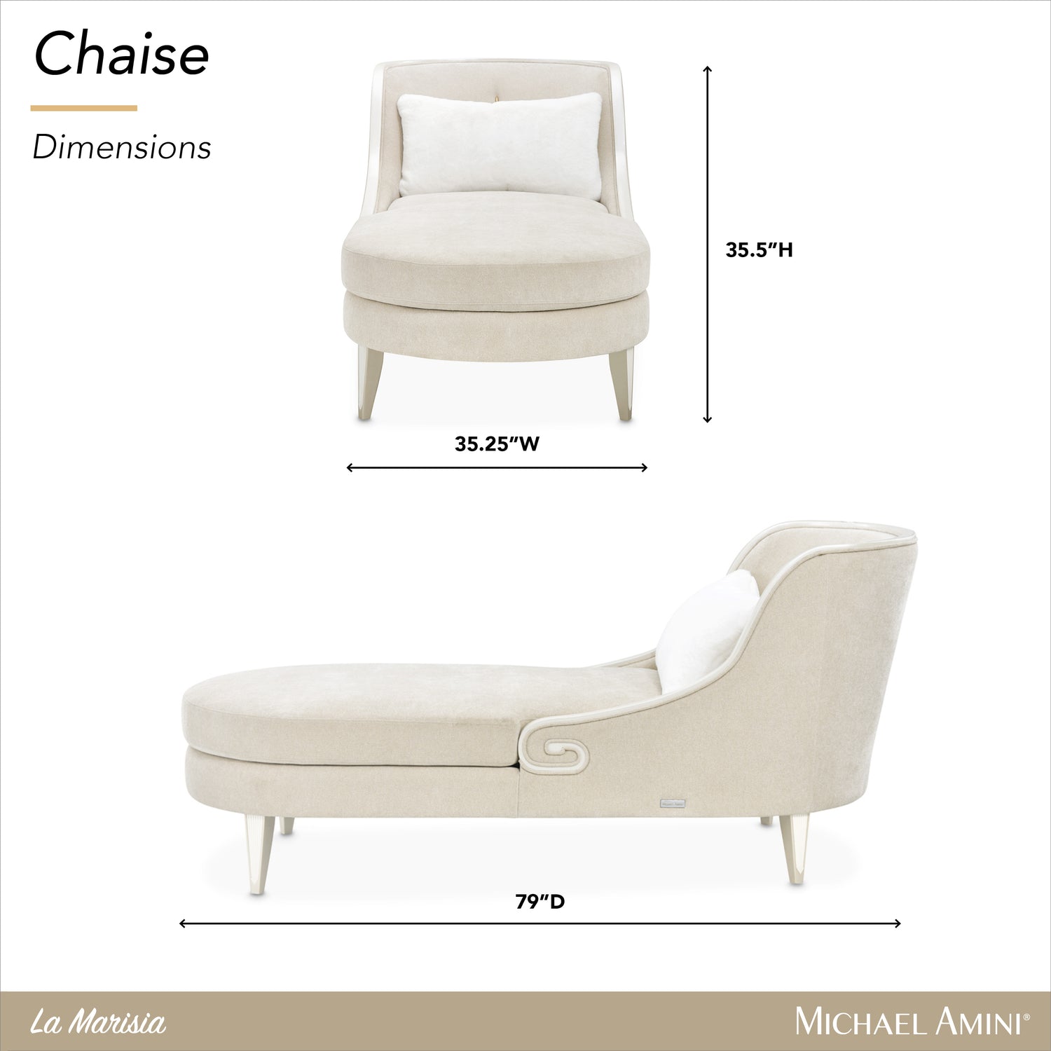 Indulge in elegance with the La Marisia Chaise, where graceful curves meet plush comfort. Upholstered in sumptuously soft chenille, this piece invites relaxation with its gently contoured silhouette. A luminous pearl-finished frame accentuates the sweeping backrest, adorned with a gold metal tuft for a touch of glamour. Greek Key-inspired scroll arms add an artistic flourish, making this chaise a statement of sophistication. Complete with a feather-filled faux-fur accent pillow, it’s the perfect blend of beauty and indulgence.