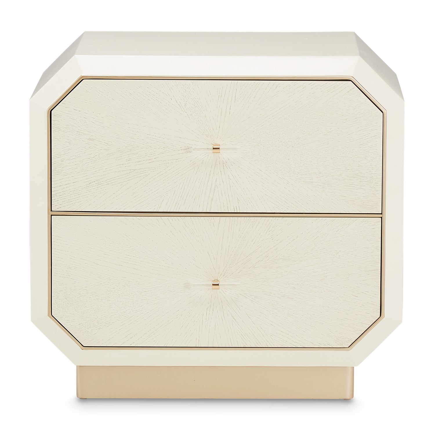 Every detail of the La Rachelle 2-Drawer Nightstand exudes luminous sophistication. Defined by clipped corners and a sculpted silhouette, this piece glows in a warm champagne finish with chardonnay gold accents that highlight its architectural form. The sunburst white oak veneer drawer fronts radiate natural beauty, while acrylic and gold bar pulls add a touch of jewelry-like brilliance. With two velvet-lined, soft-close drawers and a smooth plinth base, this nightstand blends artistry and function in perfect harmony.
