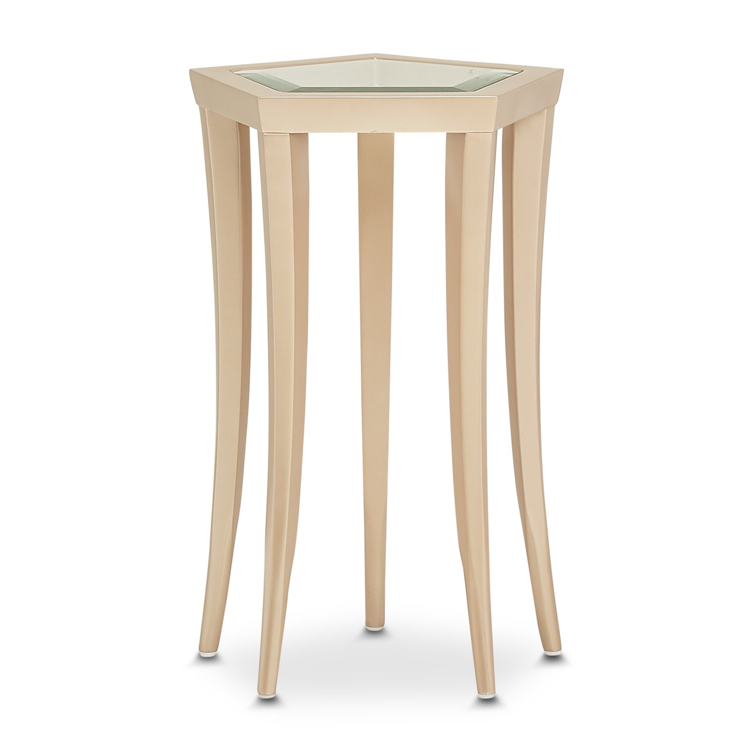 Sculptural and sophisticated, the La Rachelle Chairside Table brings a touch of modern romance to your living space. Its pentagon silhouette gleams in a chardonnay finish, while the beveled glass top reflects light like a finely cut gem. Delicately flared legs add a graceful lift, giving this piece its airy elegance. Perfect on its own or paired beside a favorite chair, it’s a refined accent designed to dazzle from every angle.
