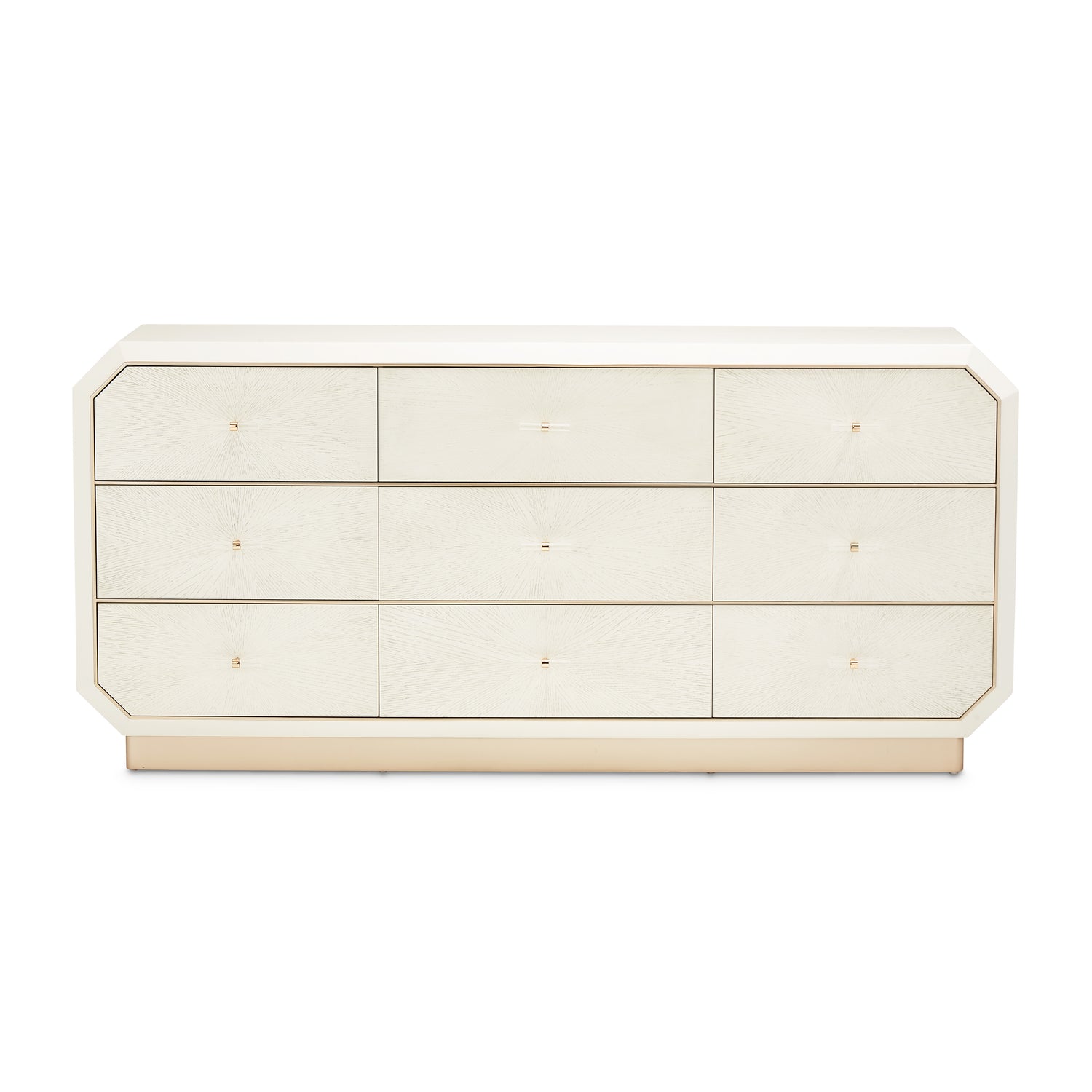 A statement of modern glamour and exquisite craftsmanship, the La Rachelle Dresser radiates with quiet opulence. Its smooth champagne finish glows with warmth, beautifully contrasted by sunburst white oak drawer fronts trimmed in chardonnay gold. Each detail—from the faceted corners to the crystal-clear acrylic pulls wrapped in gold accents—is designed to capture light and elevate your space with luminous elegance. Nine velvet-lined, soft-close drawers offer abundant storage, blending beauty and function in the most refined form.